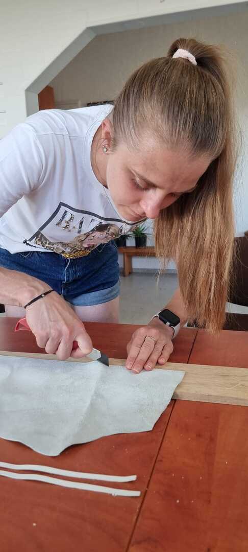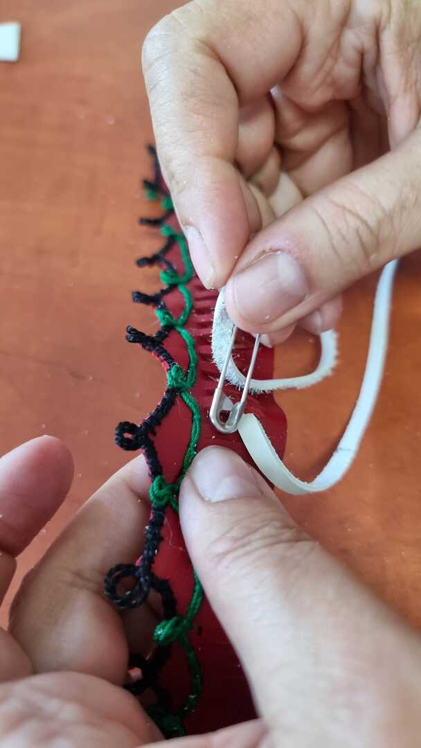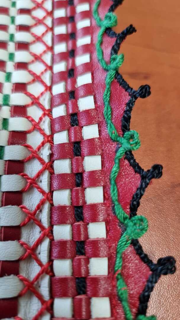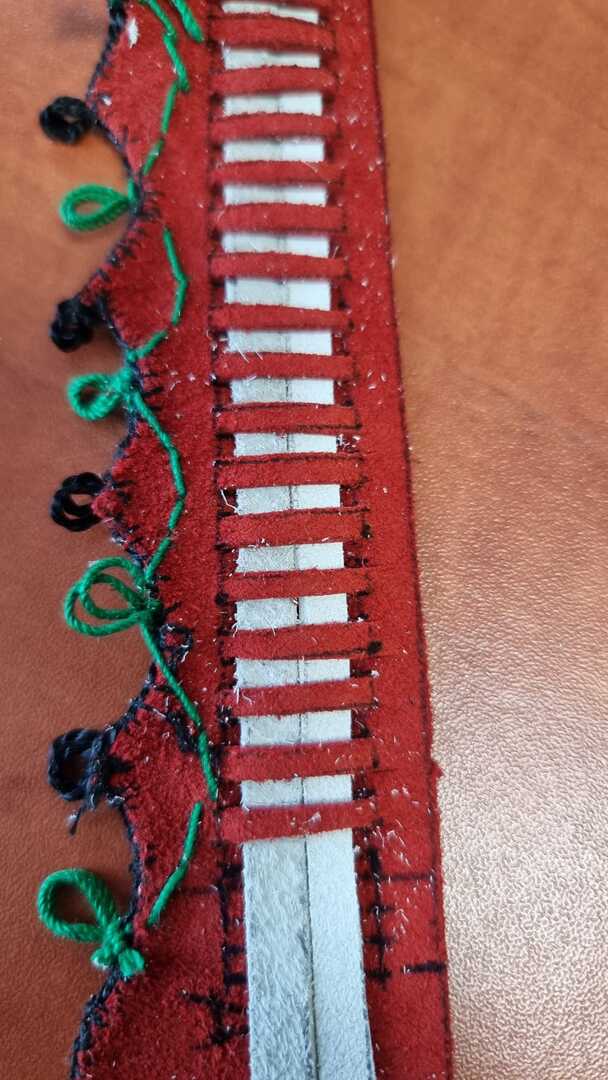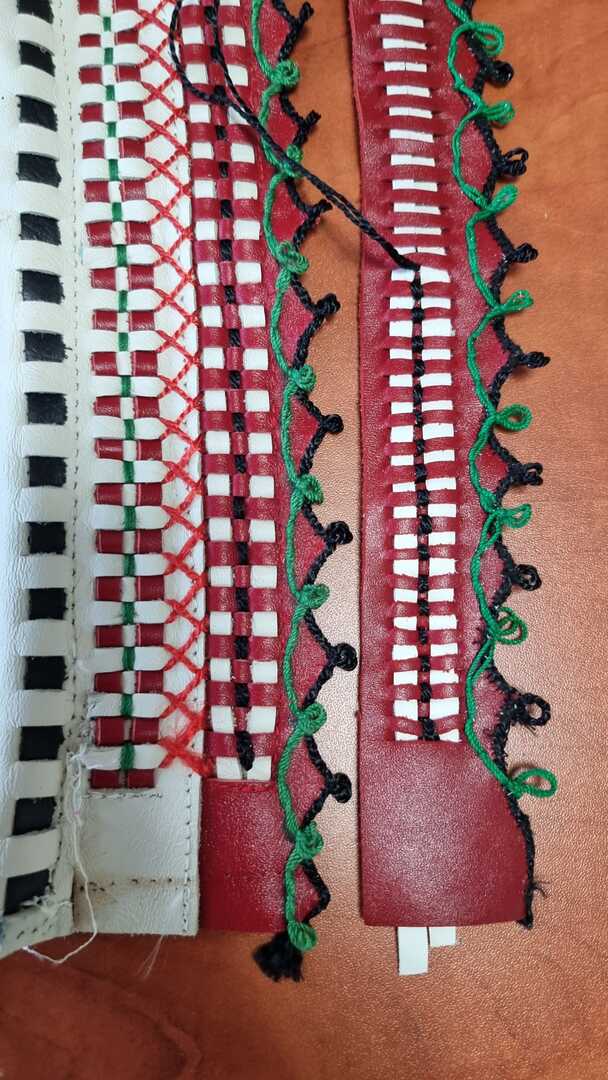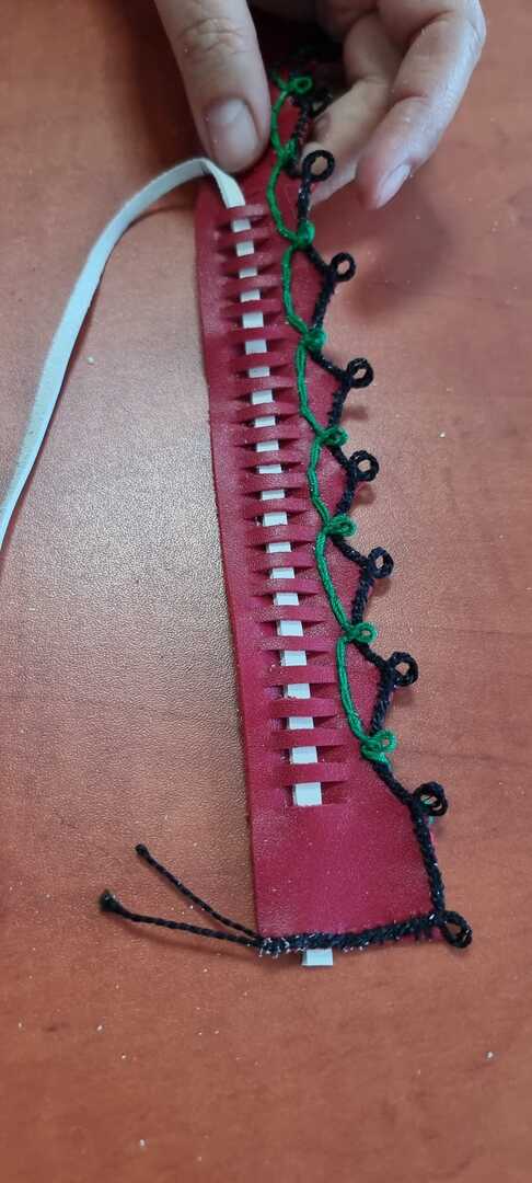 Paseczki z białej skóry wsuwane są między nacięcia i mocowane czarną nicią.