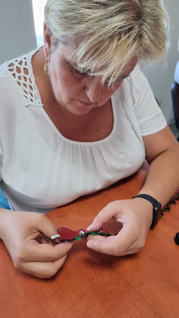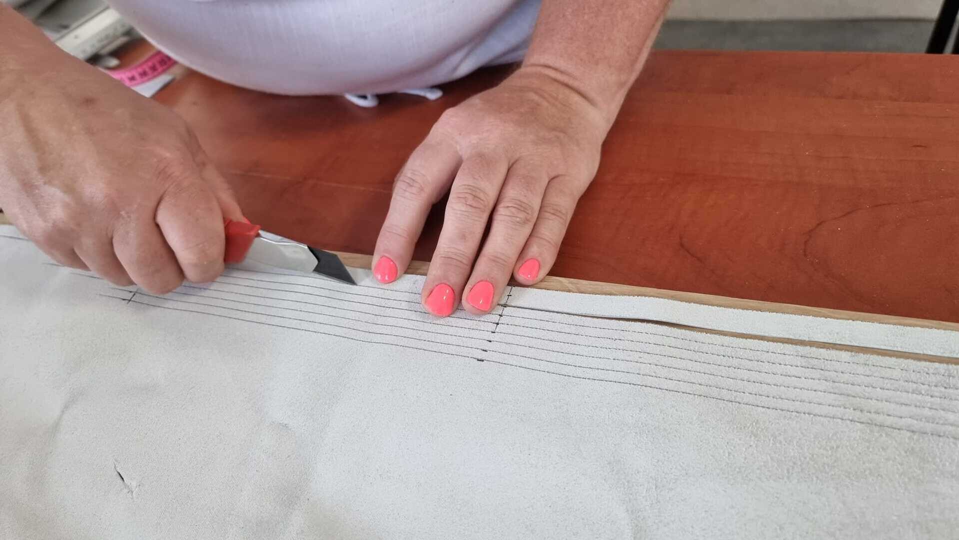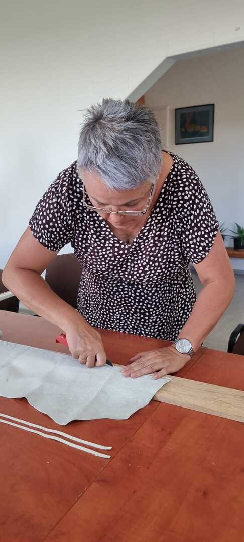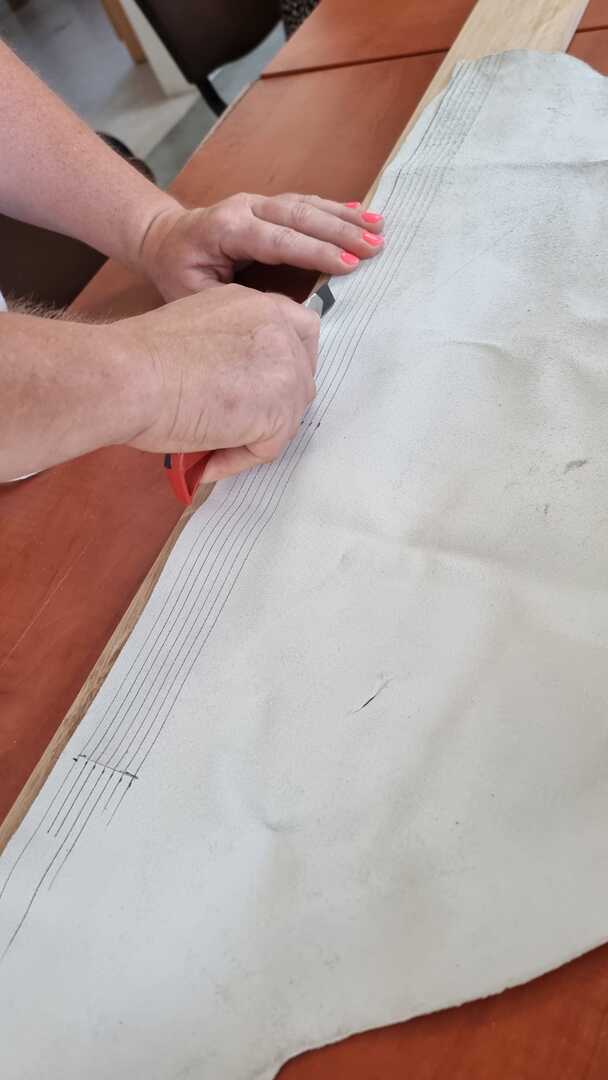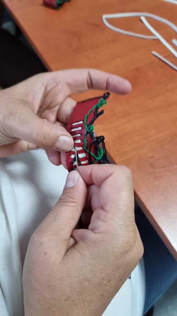 Paseczki z białej skóry wsuwane są między nacięcia i mocowane czarną nicią.