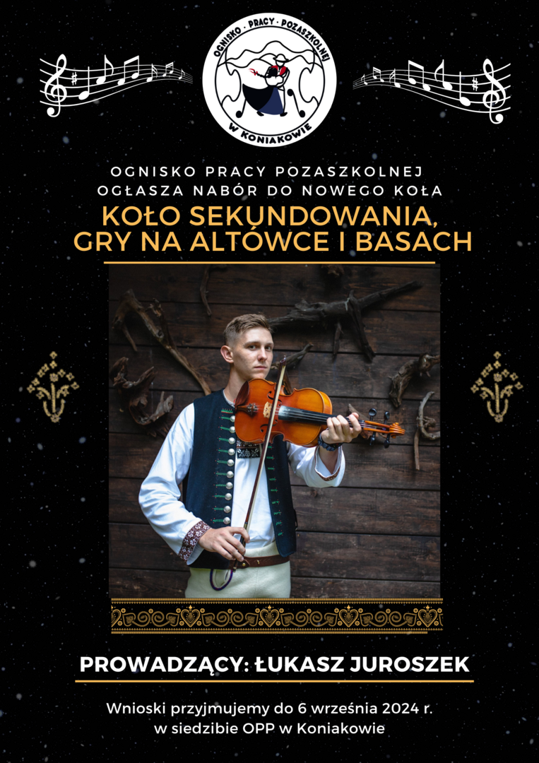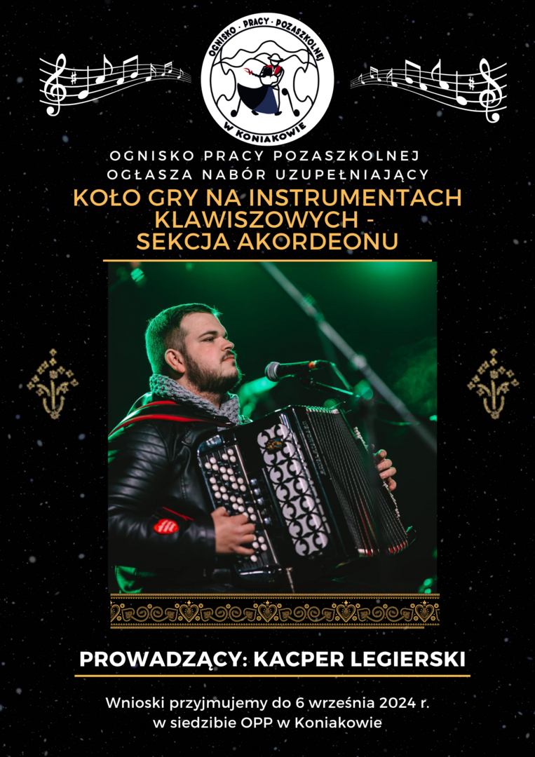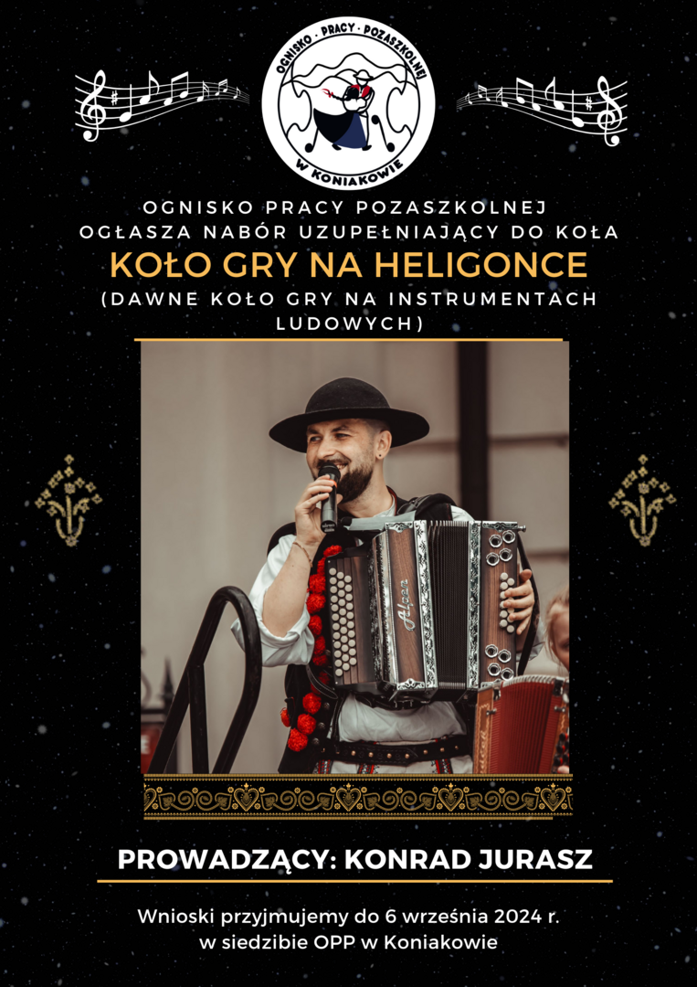 Koła gry na heligonce (dawne koło gry na instrumentach ludowych) , które poprowadzi Konrad Jurasz utalentowany muzyk i instruktor z dużymi osiągnięciami w zakresie nauczania gry na heligonce.