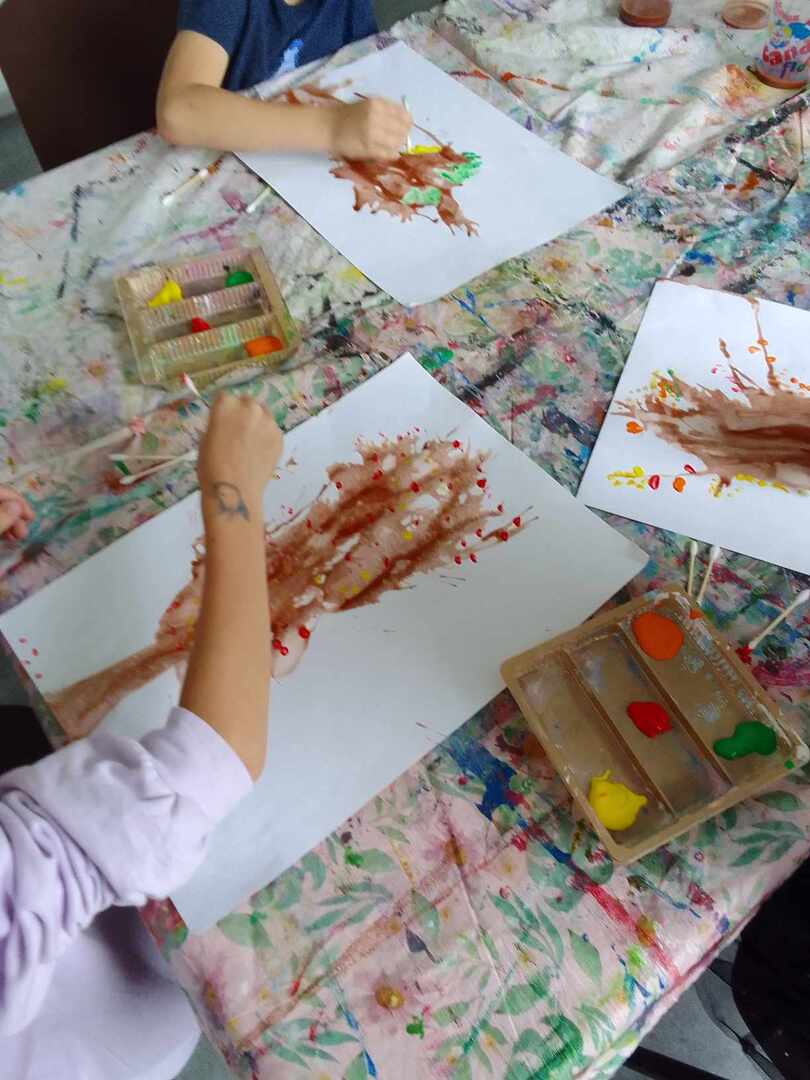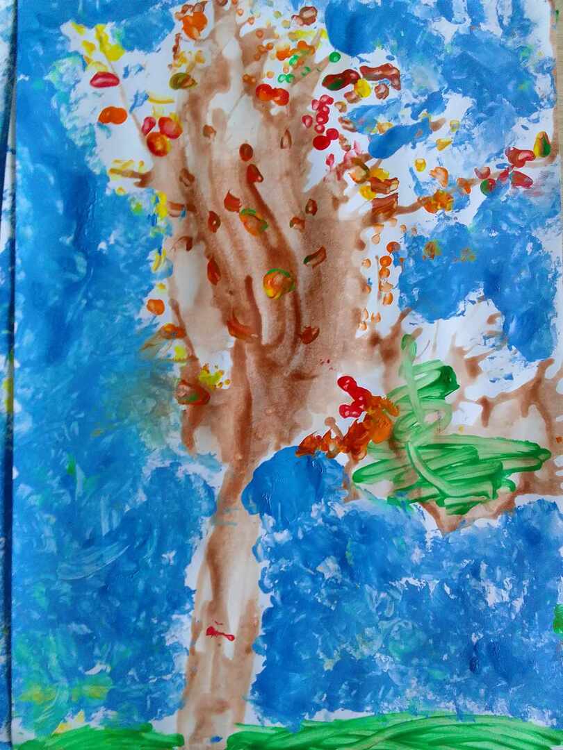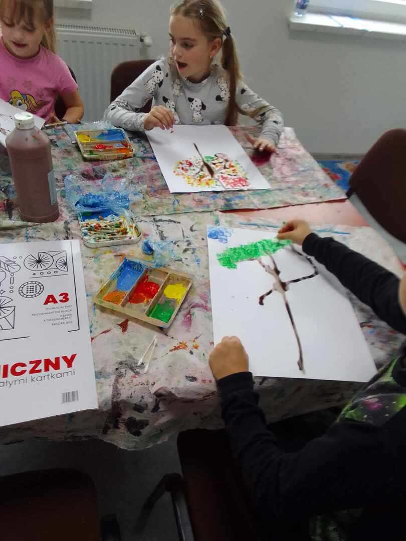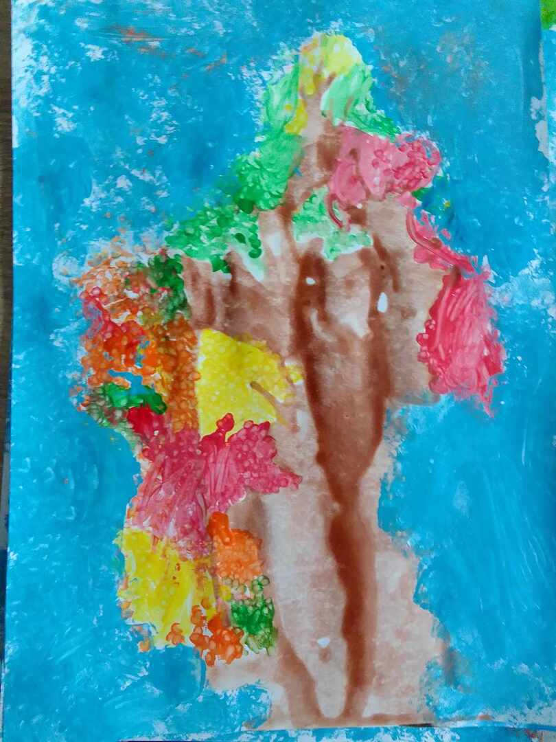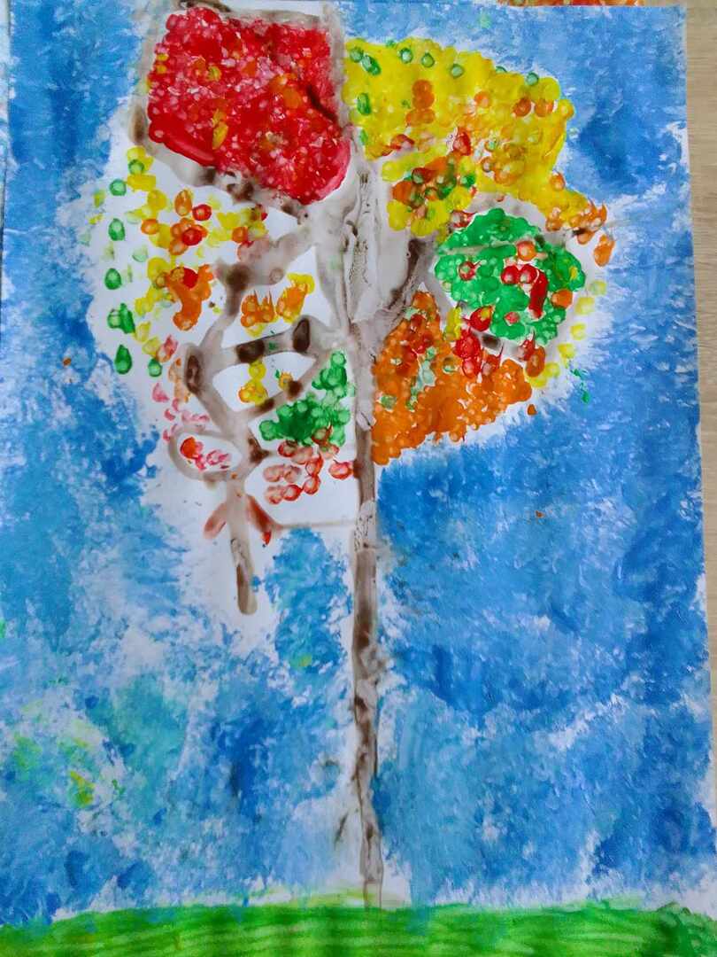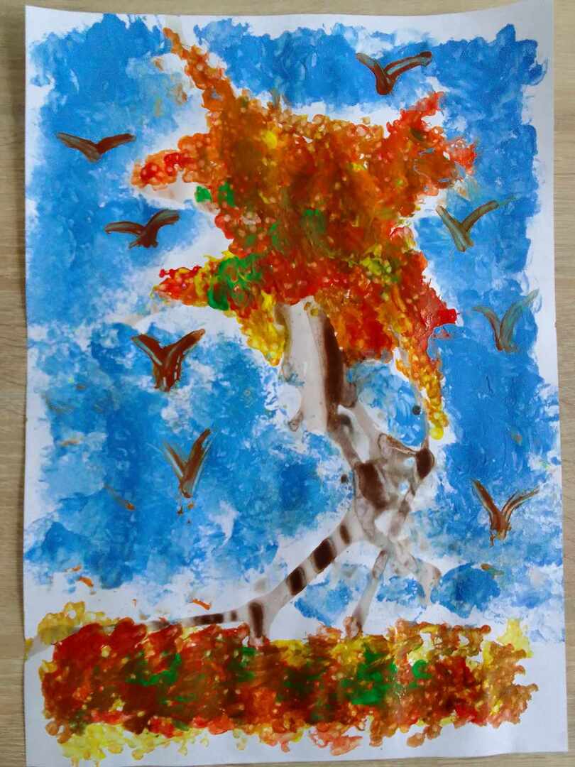 Z powstałych kleksów dzieci oczami wyobraźni mogły zobaczyć przeróżne stwory i kształty , nadając im nowe życie. Następnie do malowania kolorowych liści posłużyły patyczki, a na niebo stworzyły swoje własne pieczątki z kulek papieru i foli. Efekty ich pracy możecie podziwiać tutaj sami.