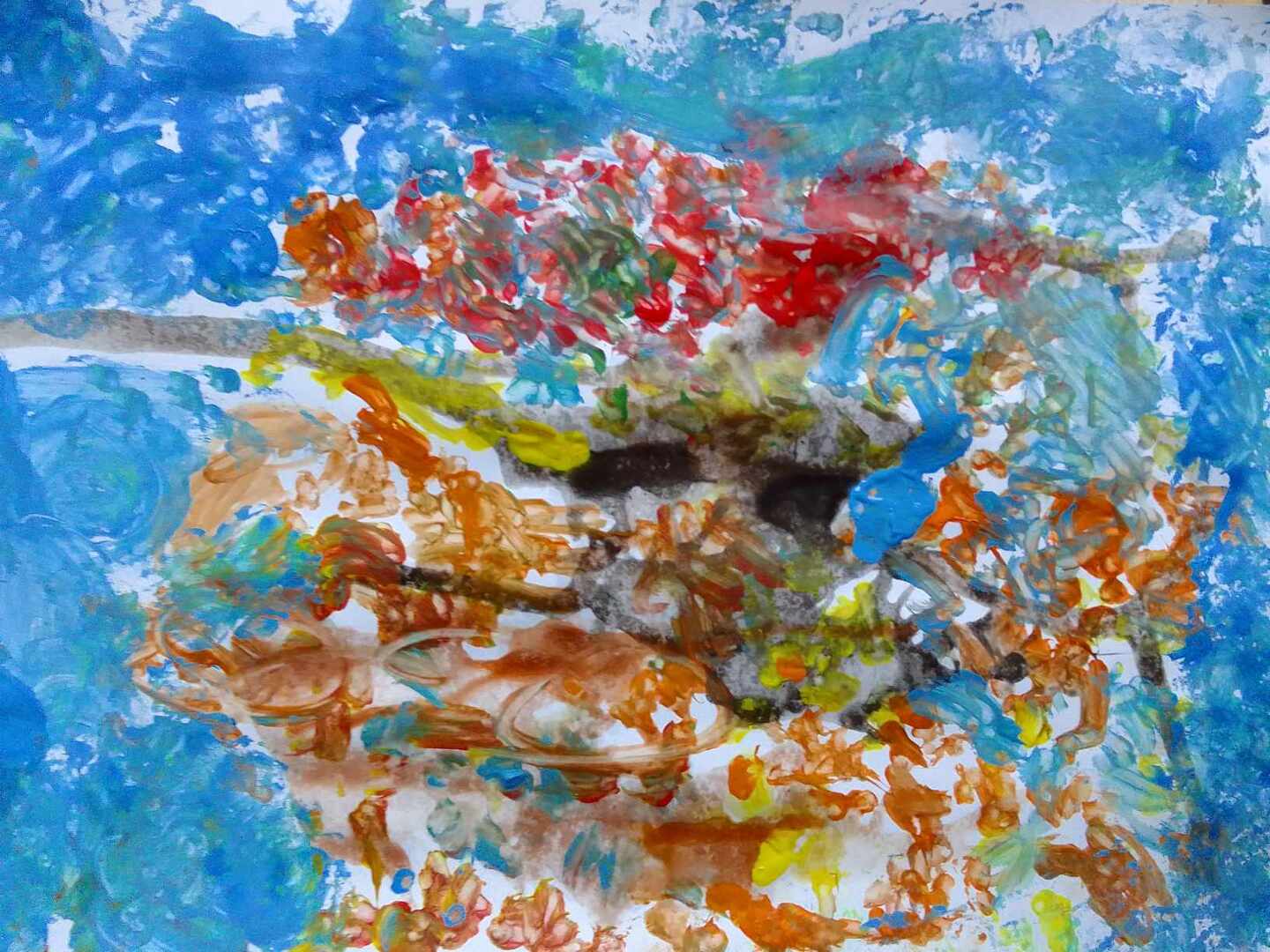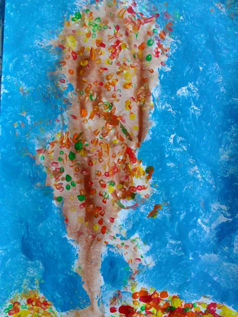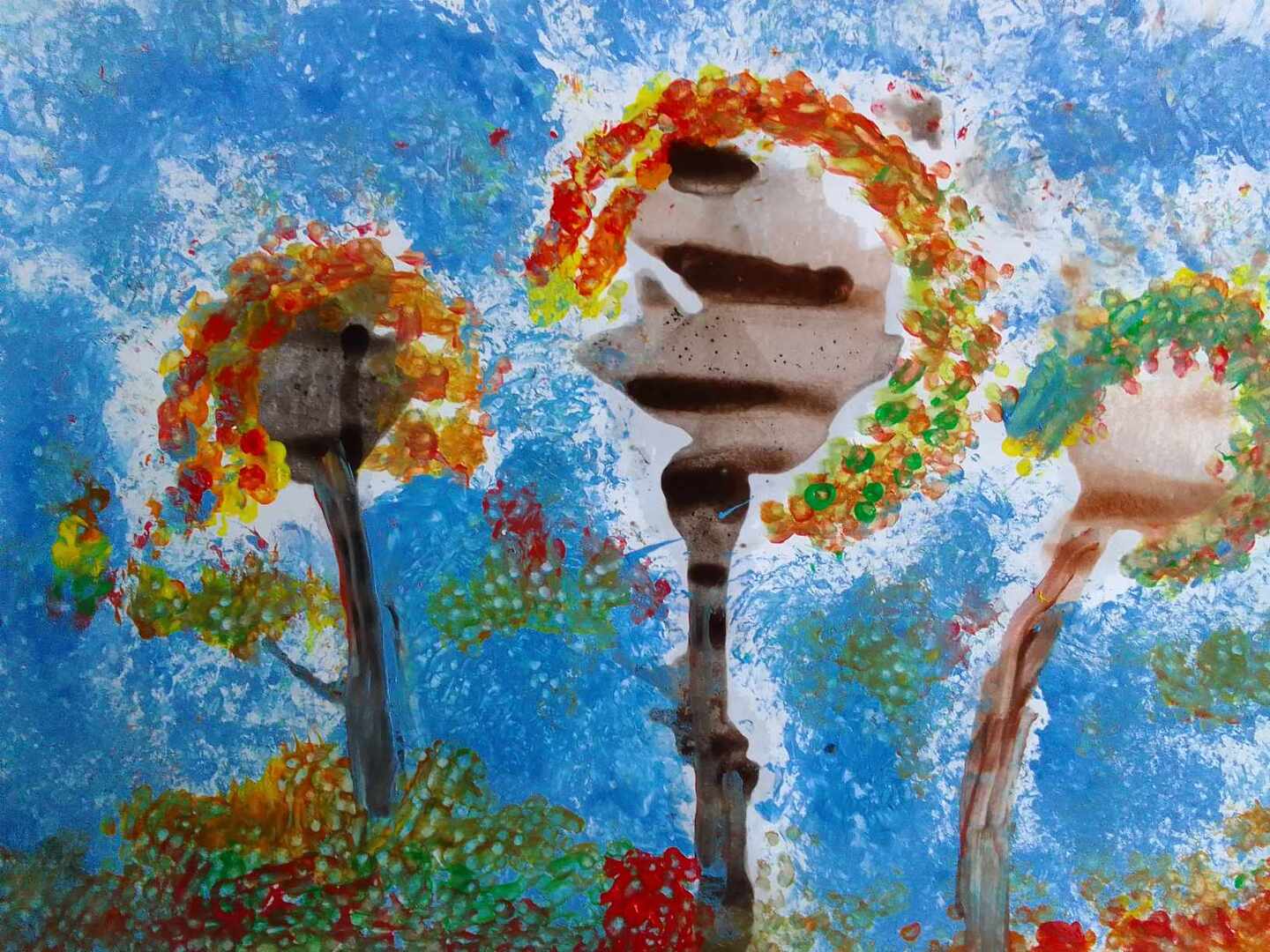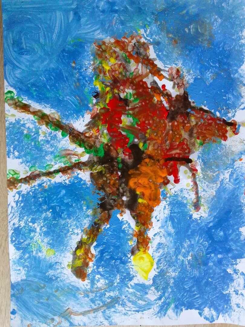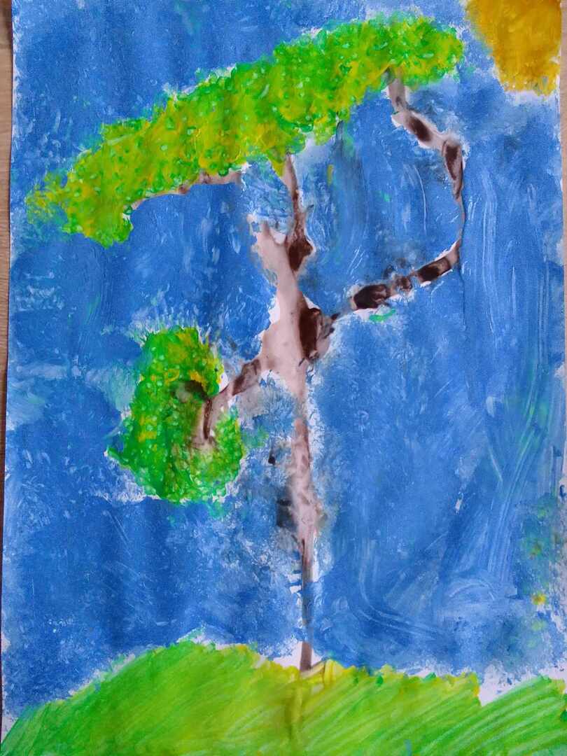 Z powstałych kleksów dzieci oczami wyobraźni mogły zobaczyć przeróżne stwory i kształty , nadając im nowe życie. Następnie do malowania kolorowych liści posłużyły patyczki, a na niebo stworzyły swoje własne pieczątki z kulek papieru i foli. Efekty ich pracy możecie podziwiać tutaj sami.