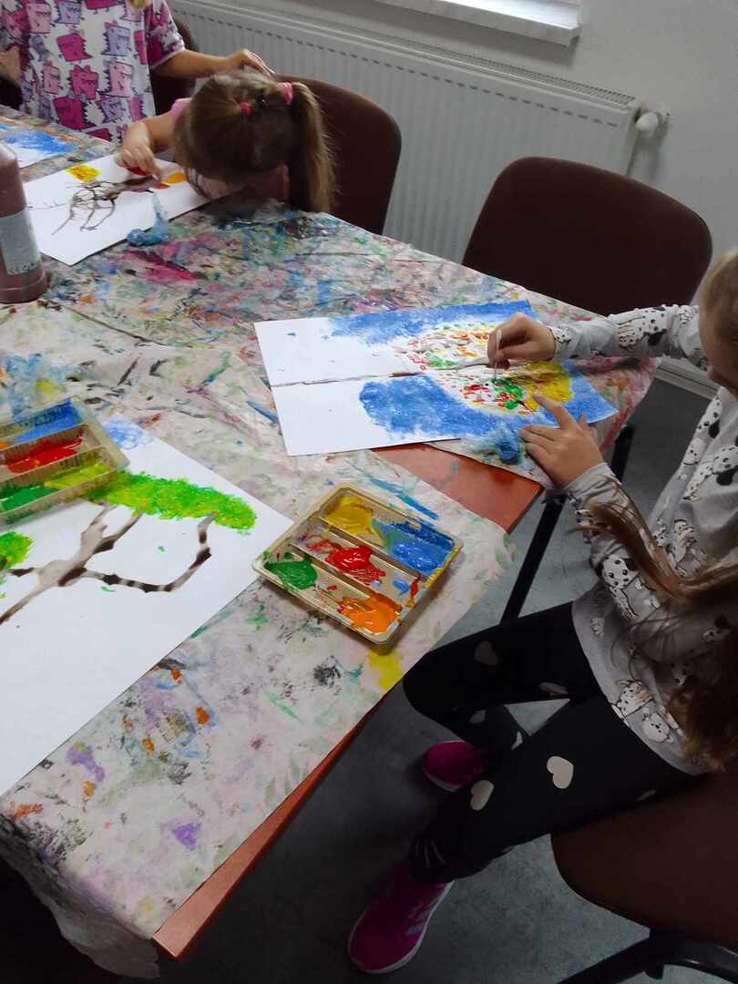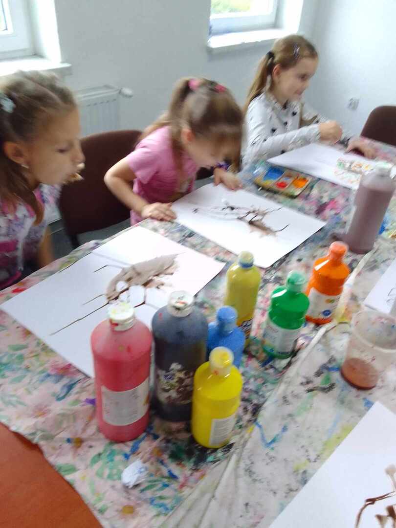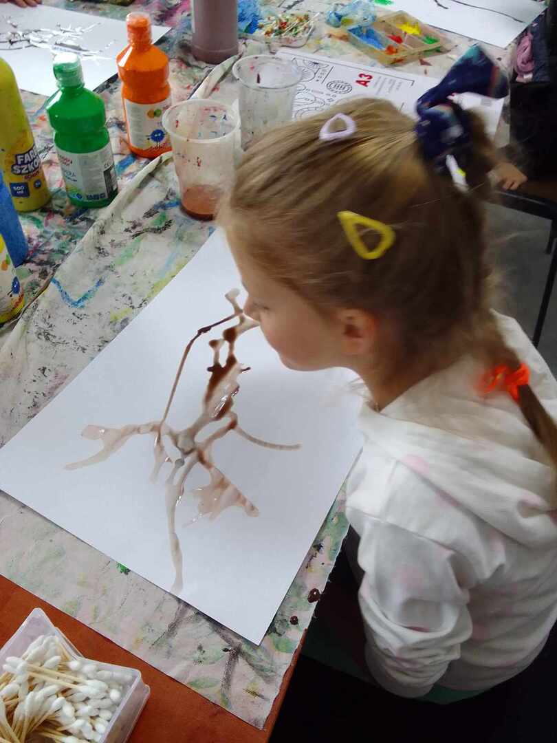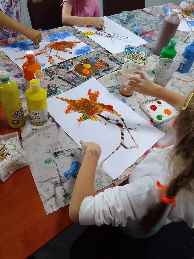 Jesienne drzewa to temat ostatnich zajęć z koła malarstwa. Dzieci pod kierunkiem pani Basi Bielesz tym razem tworzyły swoje prace bez użycia pędzelków. Do malowania pnia posłużyła im „siła wiatru” , którą musiały wydobyć z swoich płuc mocno dmuchając w krople farby rozlanej na papier.