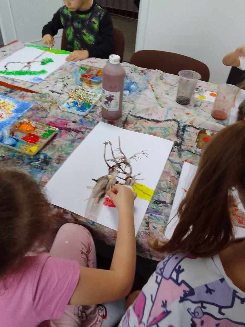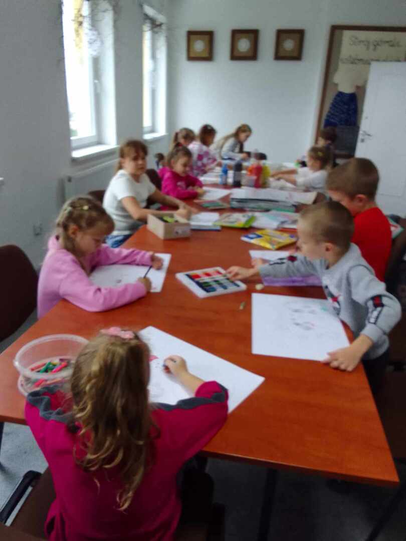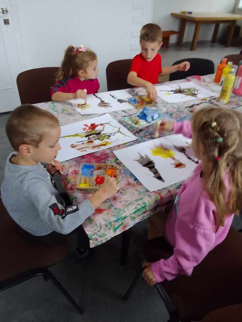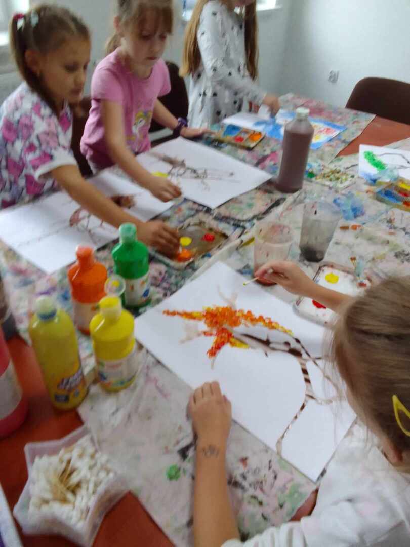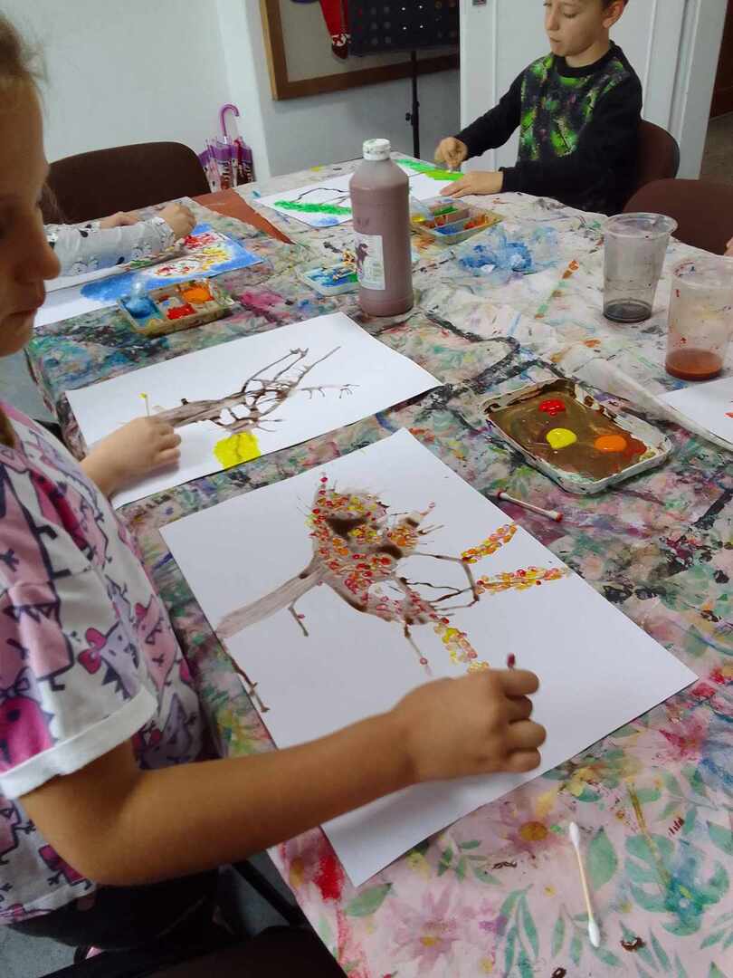 Jesienne drzewa to temat ostatnich zajęć z koła malarstwa. Dzieci pod kierunkiem pani Basi Bielesz tym razem tworzyły swoje prace bez użycia pędzelków. Do malowania pnia posłużyła im „siła wiatru” , którą musiały wydobyć z swoich płuc mocno dmuchając w krople farby rozlanej na papier.