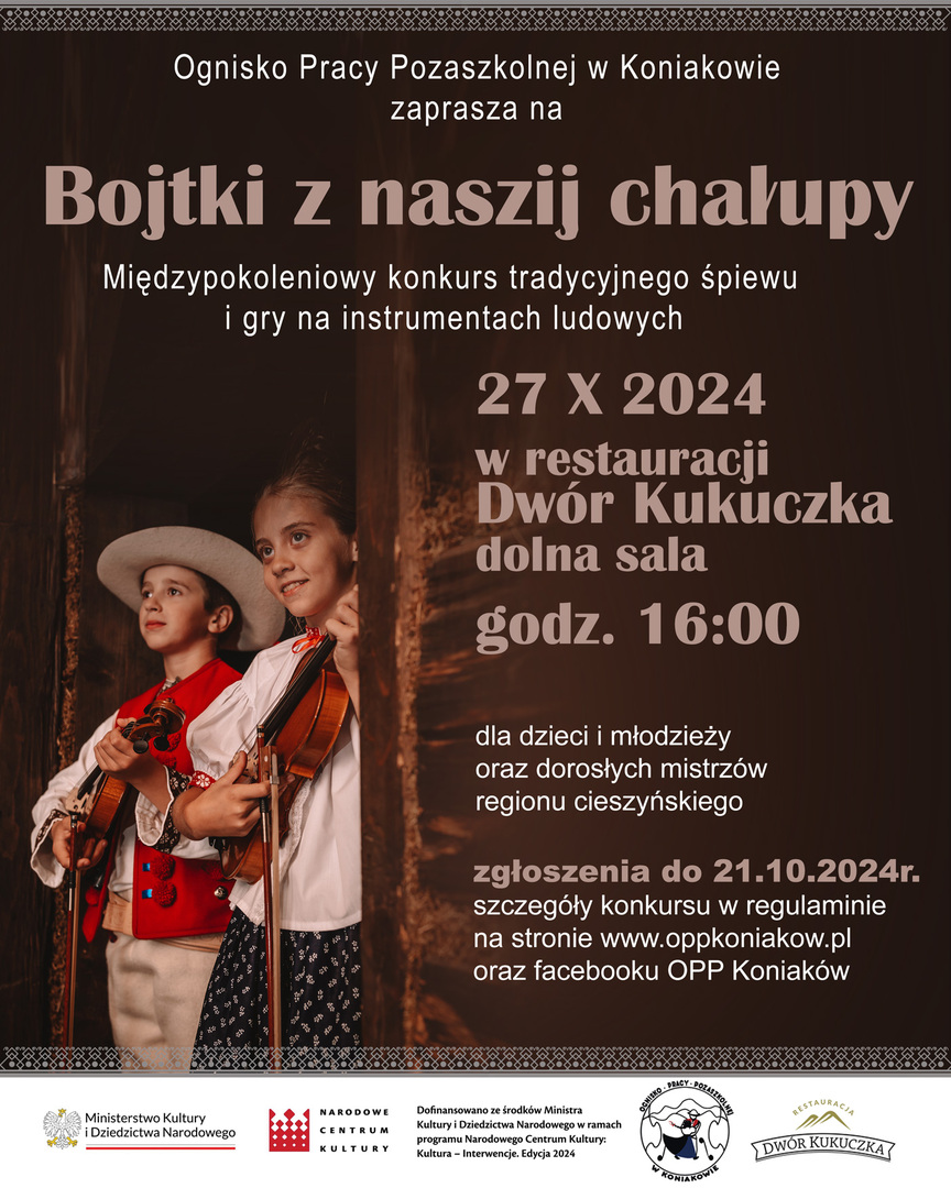 Już dziś zapraszamy na międzypokoleniowy konkurs tradycyjnego śpiewu i gry na instrumentach ludowych "Bojtki z naszyj chałpy", który odbędzie się 27 października 2024 r. o godz. 16:00 w dolnej sali restauracji Dwór Kukuczka w Istebnej.