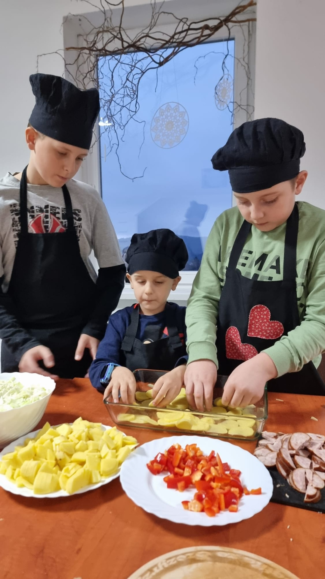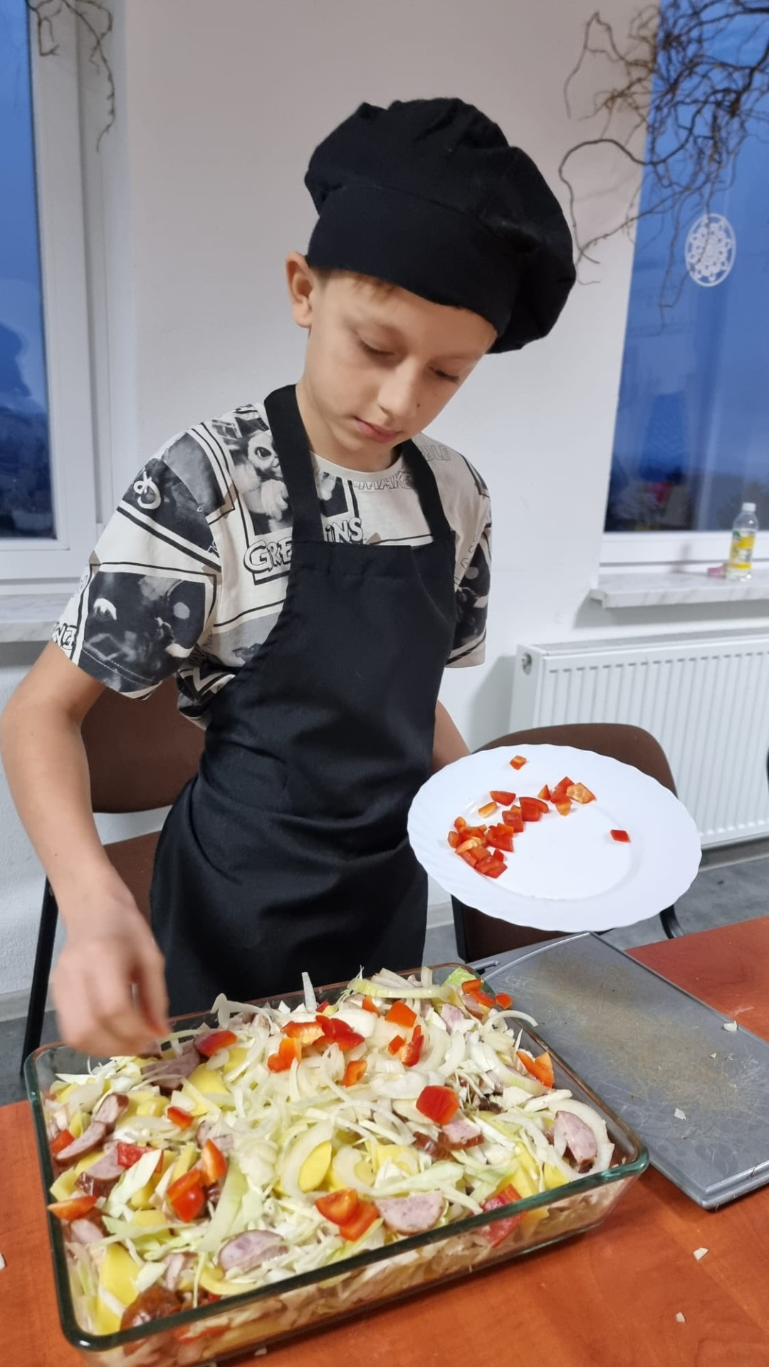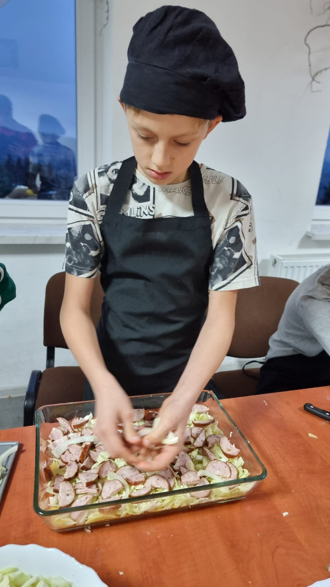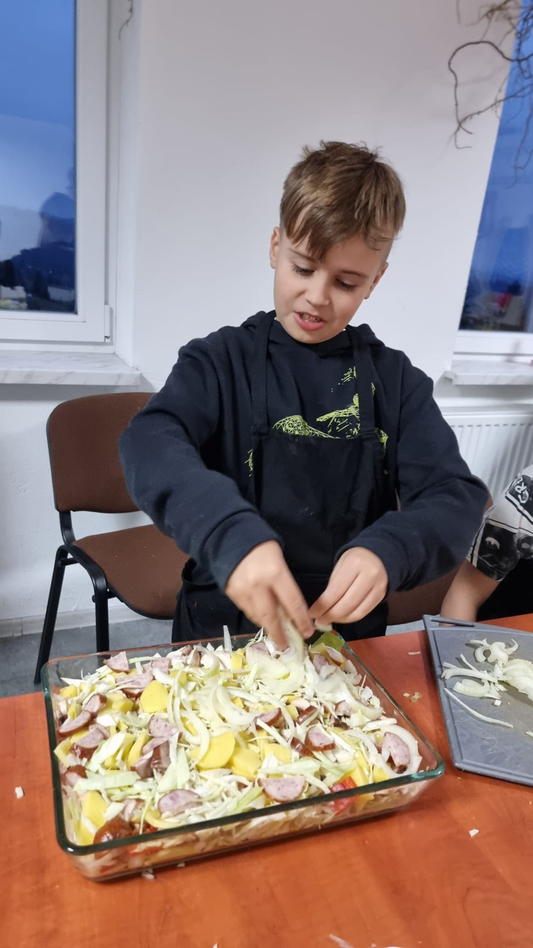 Młodzi uczestnicy najpierw kroili składniki, a następnie układali warstwami w naczyniu: ziemniaki, kiełbasę, paprykę, cebulę i aromatyczny sos. Całość hojnie posypali startym serem, a zapiekanka trafiła do piekarnika. Podczas pieczenia dzieci z niecierpliwością obserwowały, jak potrawa nabiera złocistego koloru i kuszącego zapachu.