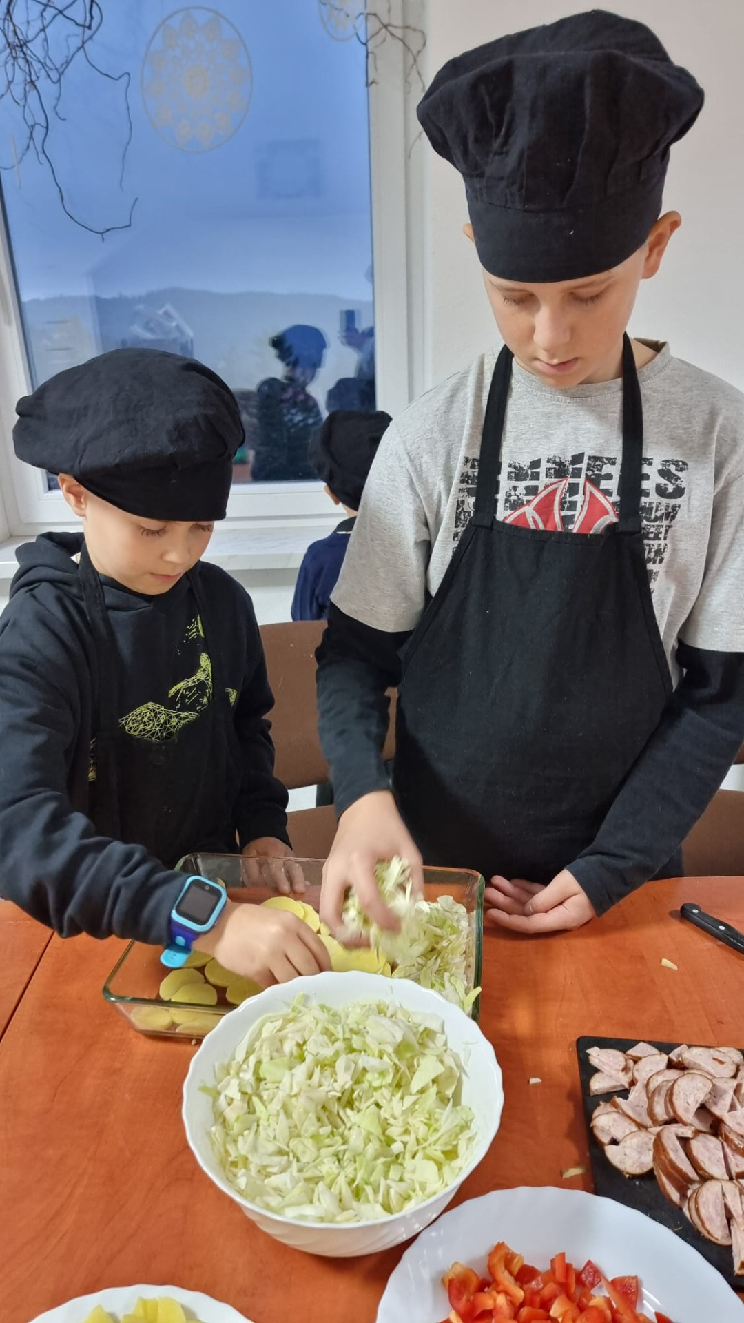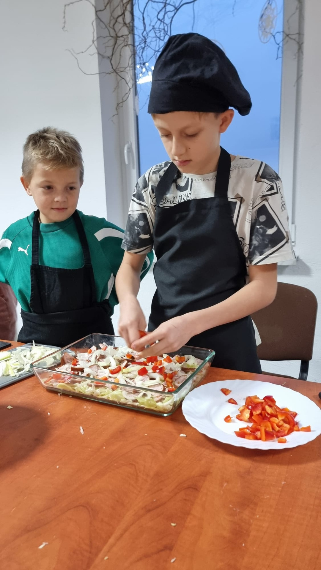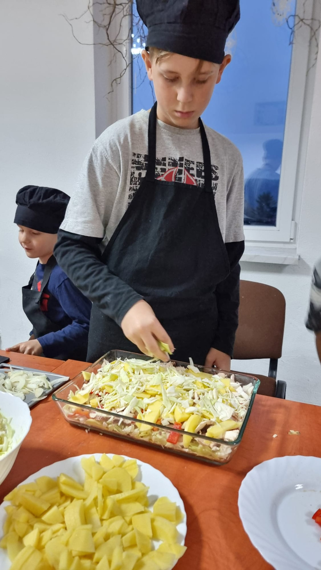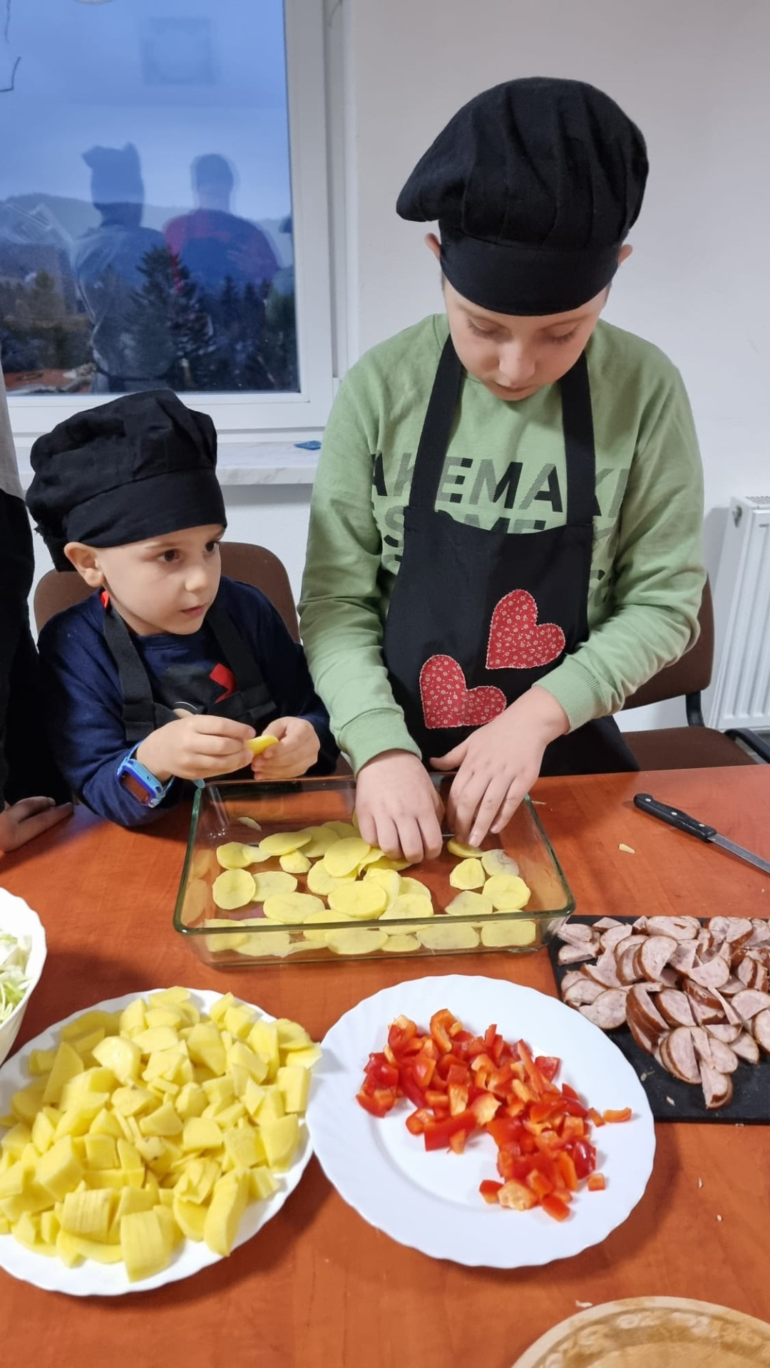 Młodzi uczestnicy najpierw kroili składniki, a następnie układali warstwami w naczyniu: ziemniaki, kiełbasę, paprykę, cebulę i aromatyczny sos. Całość hojnie posypali startym serem, a zapiekanka trafiła do piekarnika. Podczas pieczenia dzieci z niecierpliwością obserwowały, jak potrawa nabiera złocistego koloru i kuszącego zapachu.