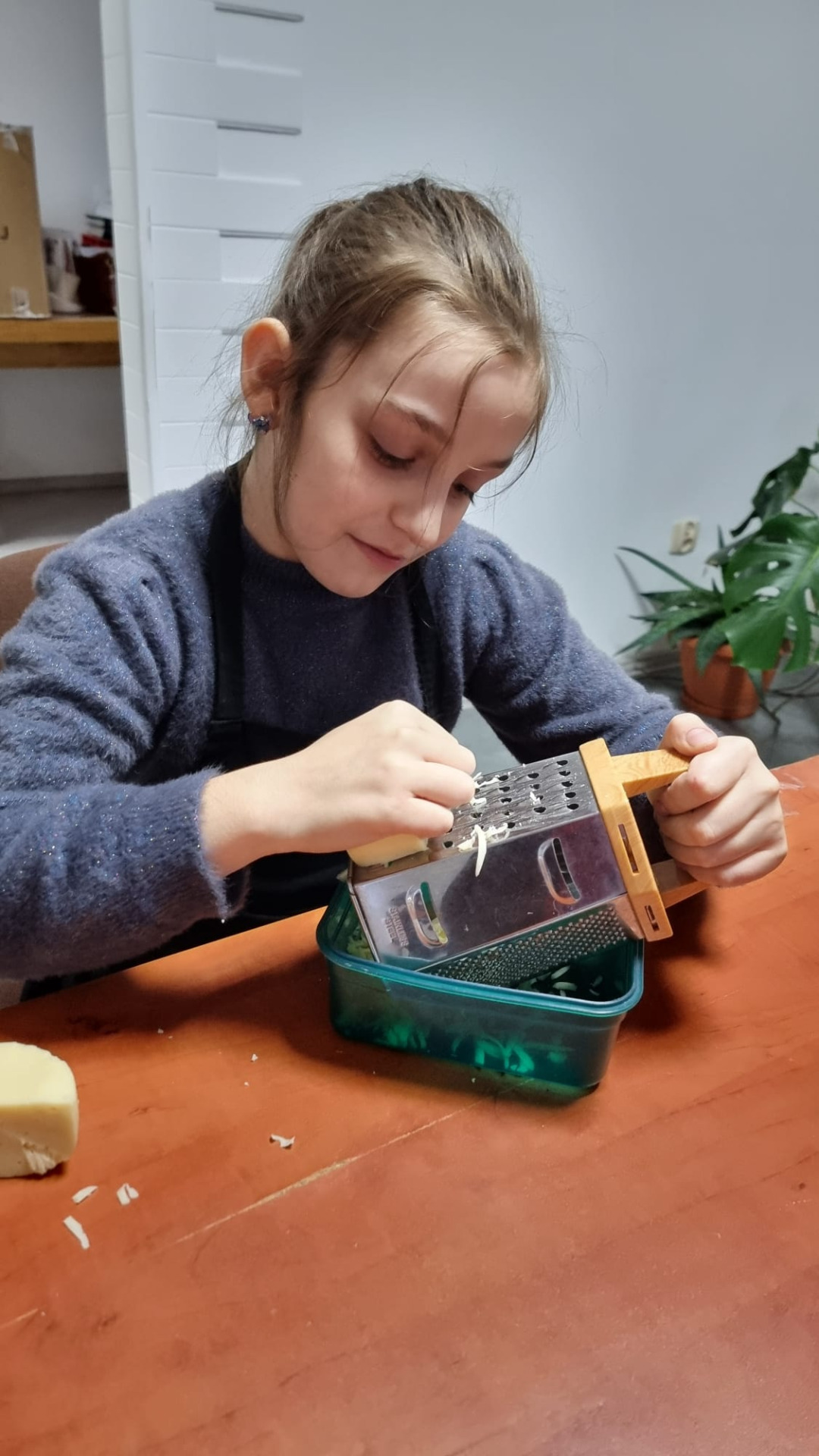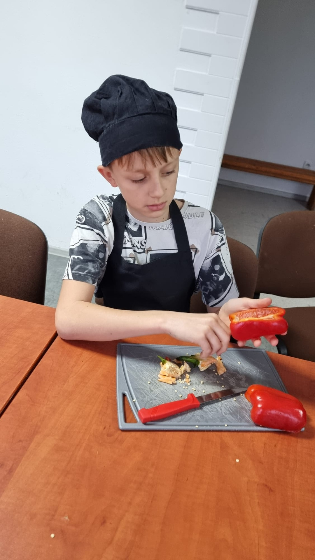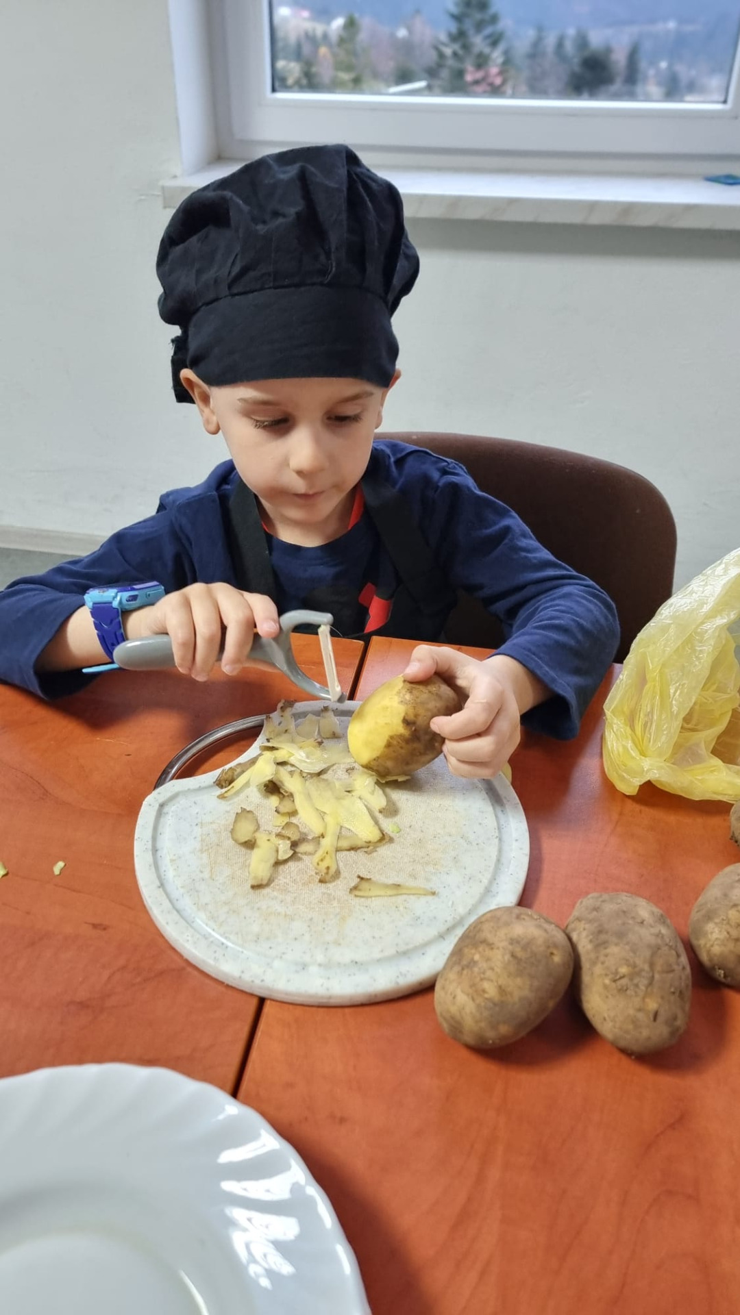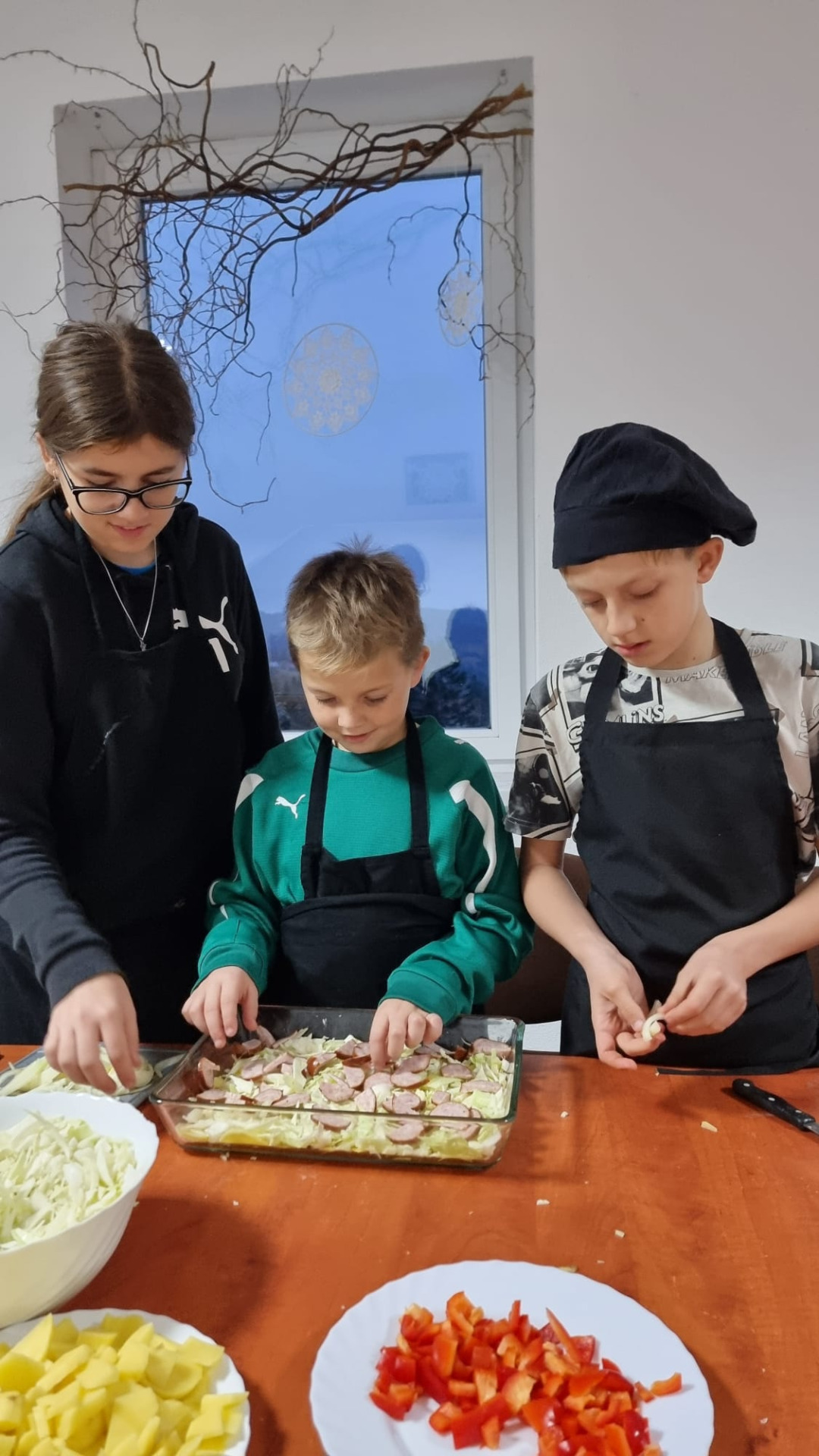 Młodzi uczestnicy najpierw kroili składniki, a następnie układali warstwami w naczyniu: ziemniaki, kiełbasę, paprykę, cebulę i aromatyczny sos. Całość hojnie posypali startym serem, a zapiekanka trafiła do piekarnika. Podczas pieczenia dzieci z niecierpliwością obserwowały, jak potrawa nabiera złocistego koloru i kuszącego zapachu.