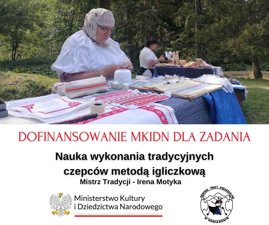 🧵🪡 Projekt Fundacji Dziedzictwo działającej przy Ognisko Pracy Pozaszkolnej w Koniakowie pn. "Nauka wykonania tradycyjnych czepców metodą igliczkową" otrzymał dofinansowanie od Ministerstwo Kultury i Dziedzictwa Narodowego w ramach programu Kultura ludowa i tradycyjna - Mistrz Tradycji.