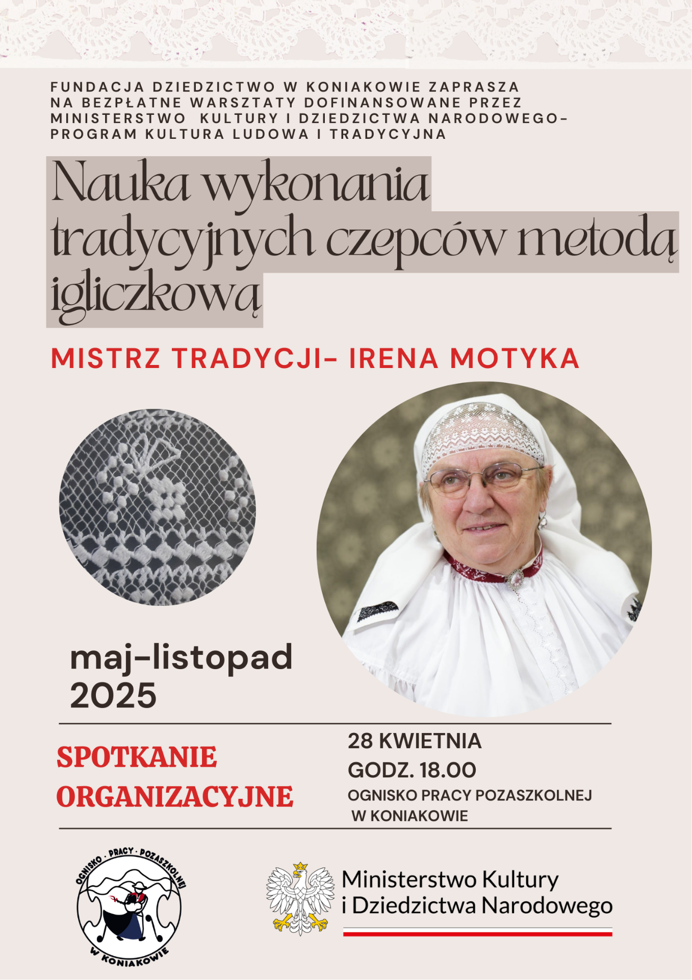 Warsztaty realizowane są w ramach projektu „Nauka wykonania tradycyjnych czepców metodą igliczkową” – mistrz tradycji Irena Motyka, organizowanego przez Fundację Dziedzictwo działającą przy Ognisku Pracy Pozaszkolnej w Koniakowie.