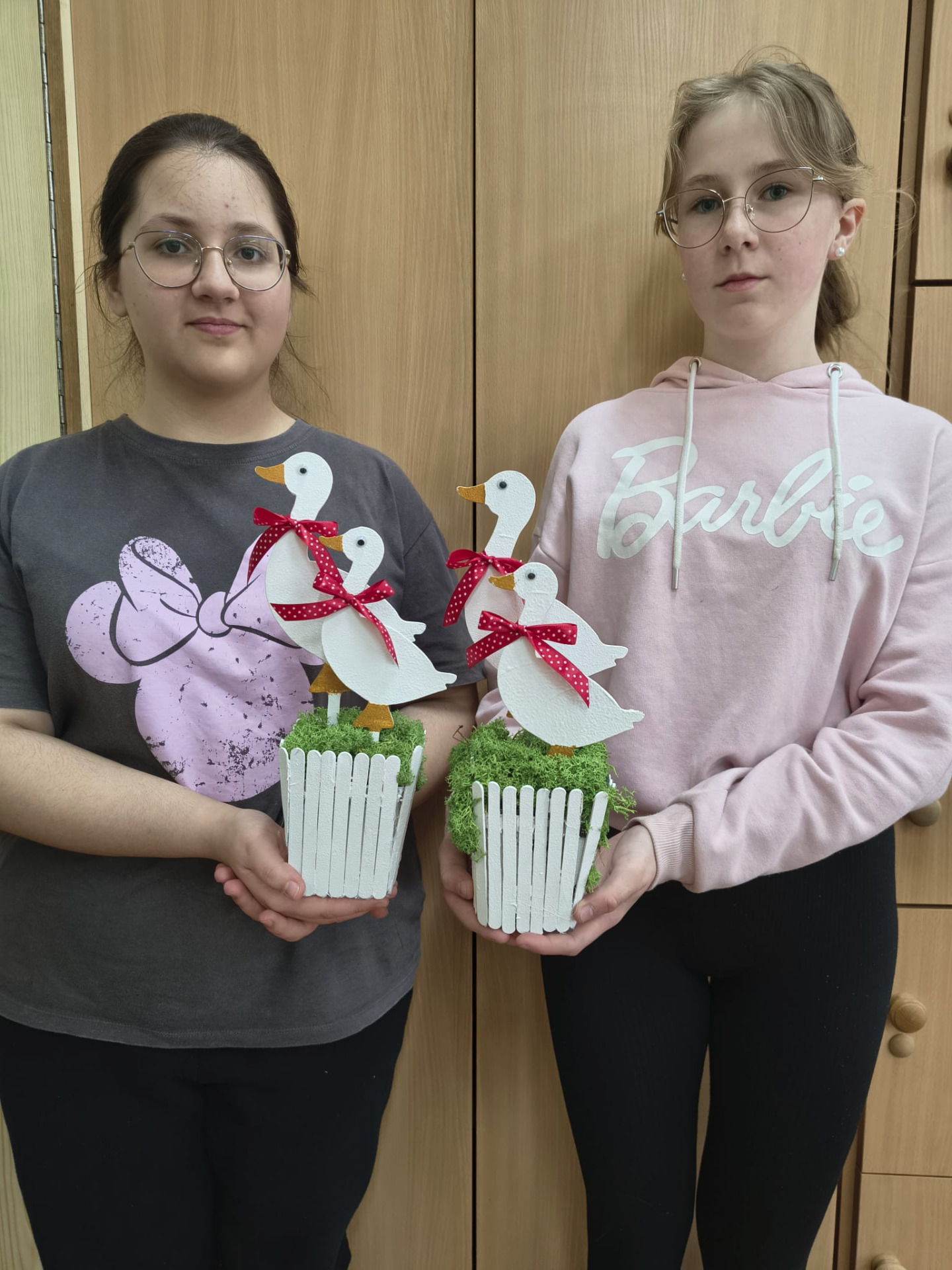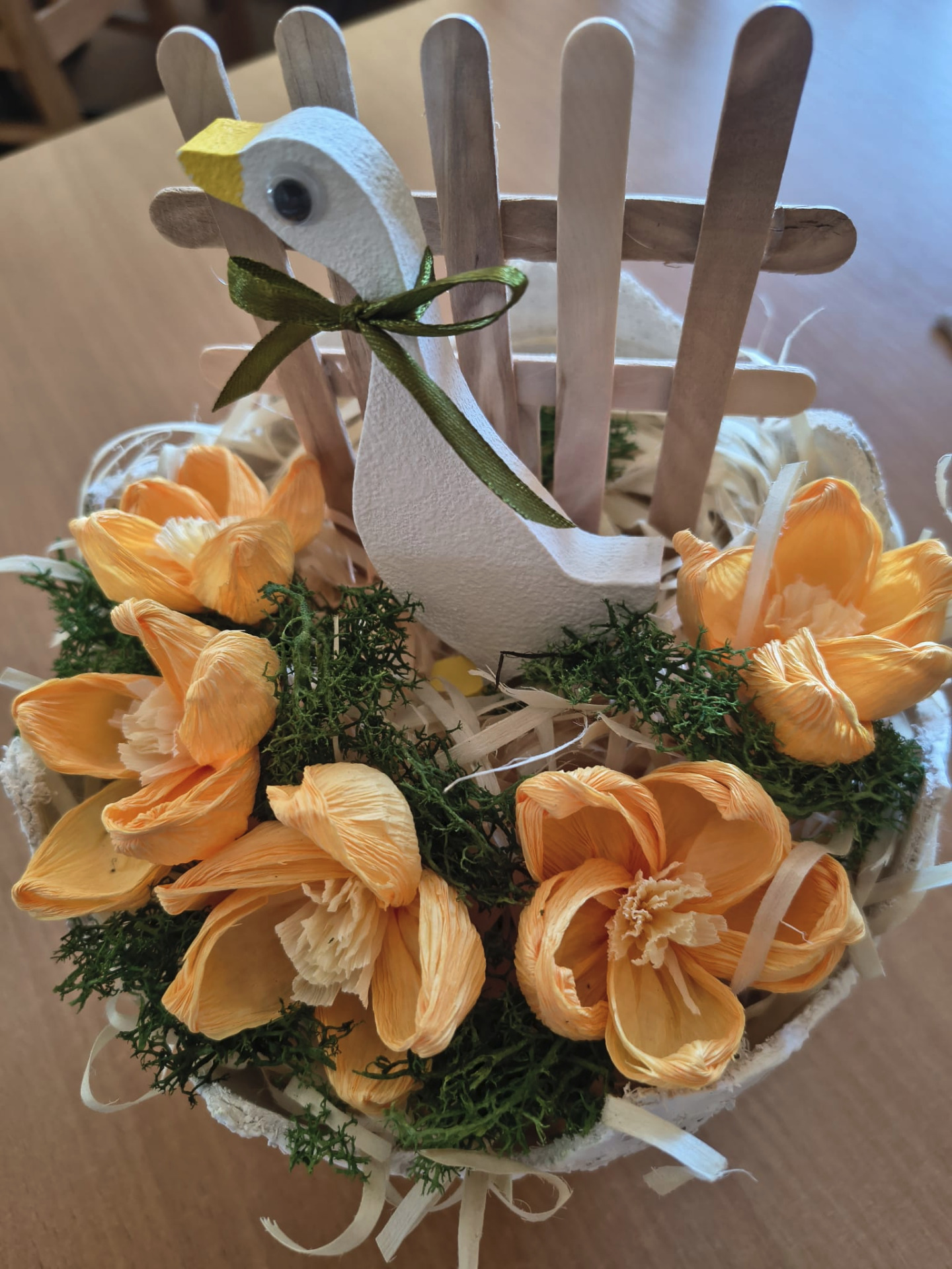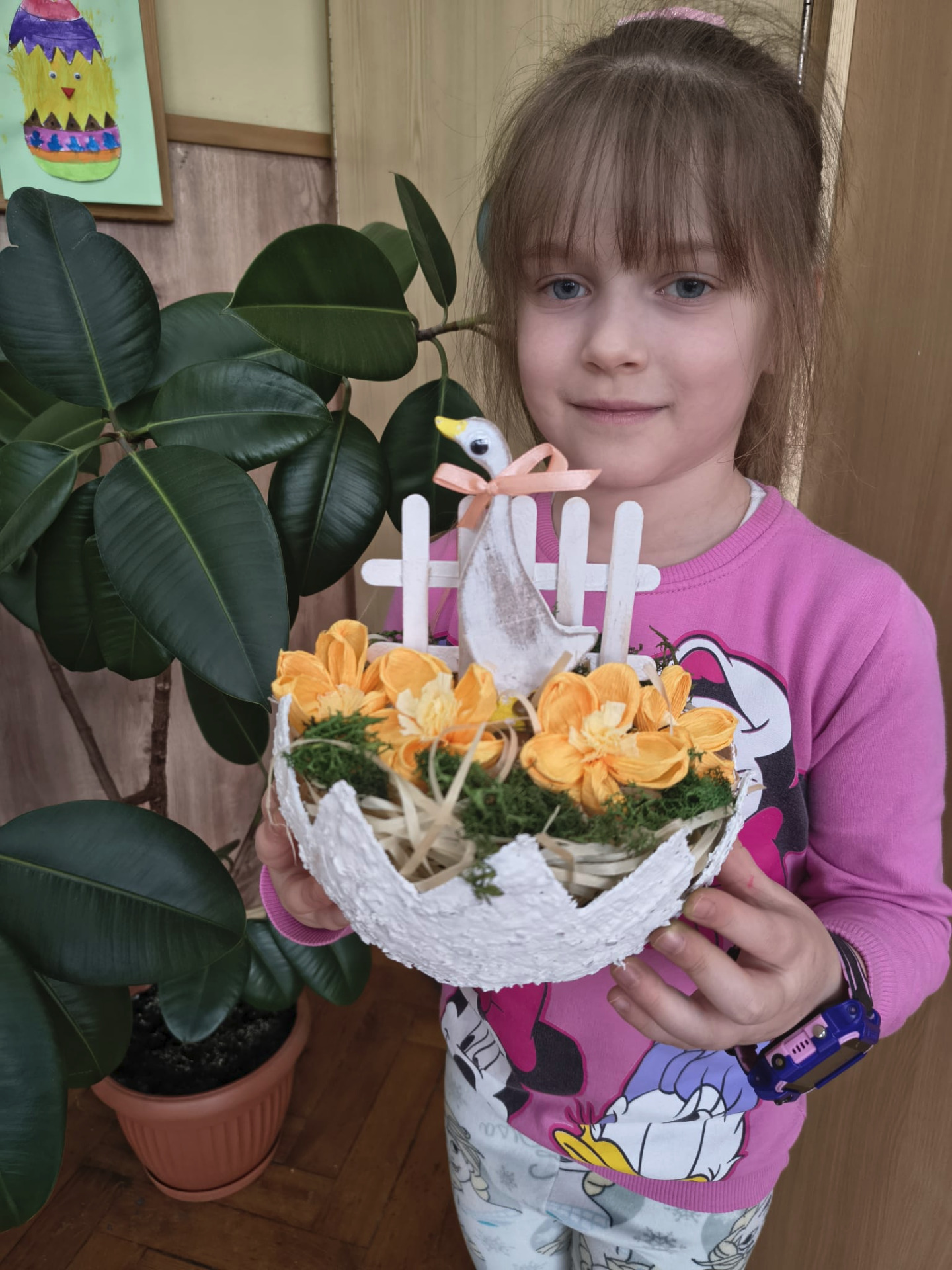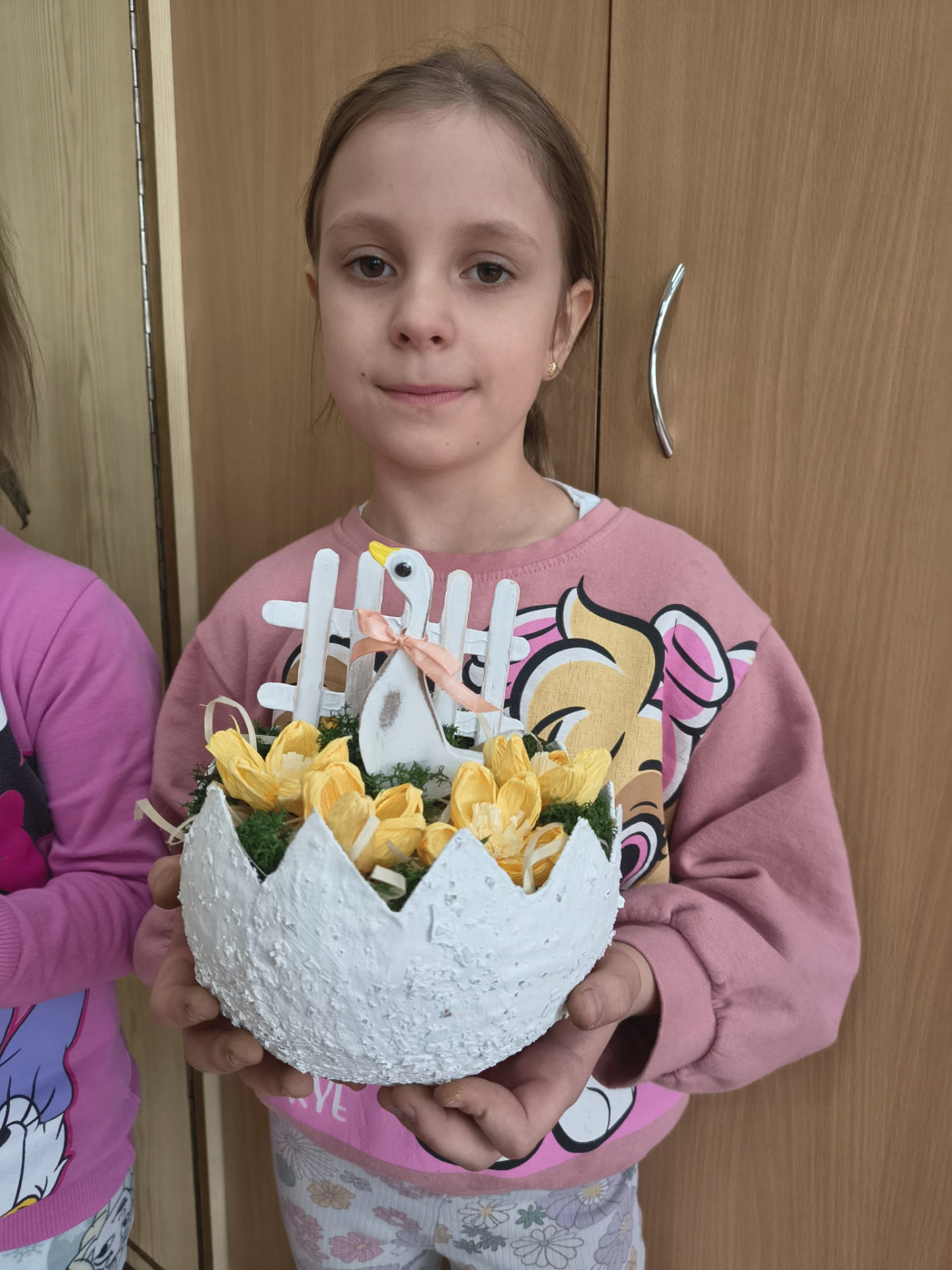 Po wysuszeniu dzieci misternie ozdobiły ją fragmentami prawdziwych skorupek, tworząc efekt delikatnej mozaiki. Kompozycję wzbogaciły kaczeńce z bibuły , drewniany płotek z patyczków po lodach i urocza gąska – symbol wiosny i odradzającego się życia.