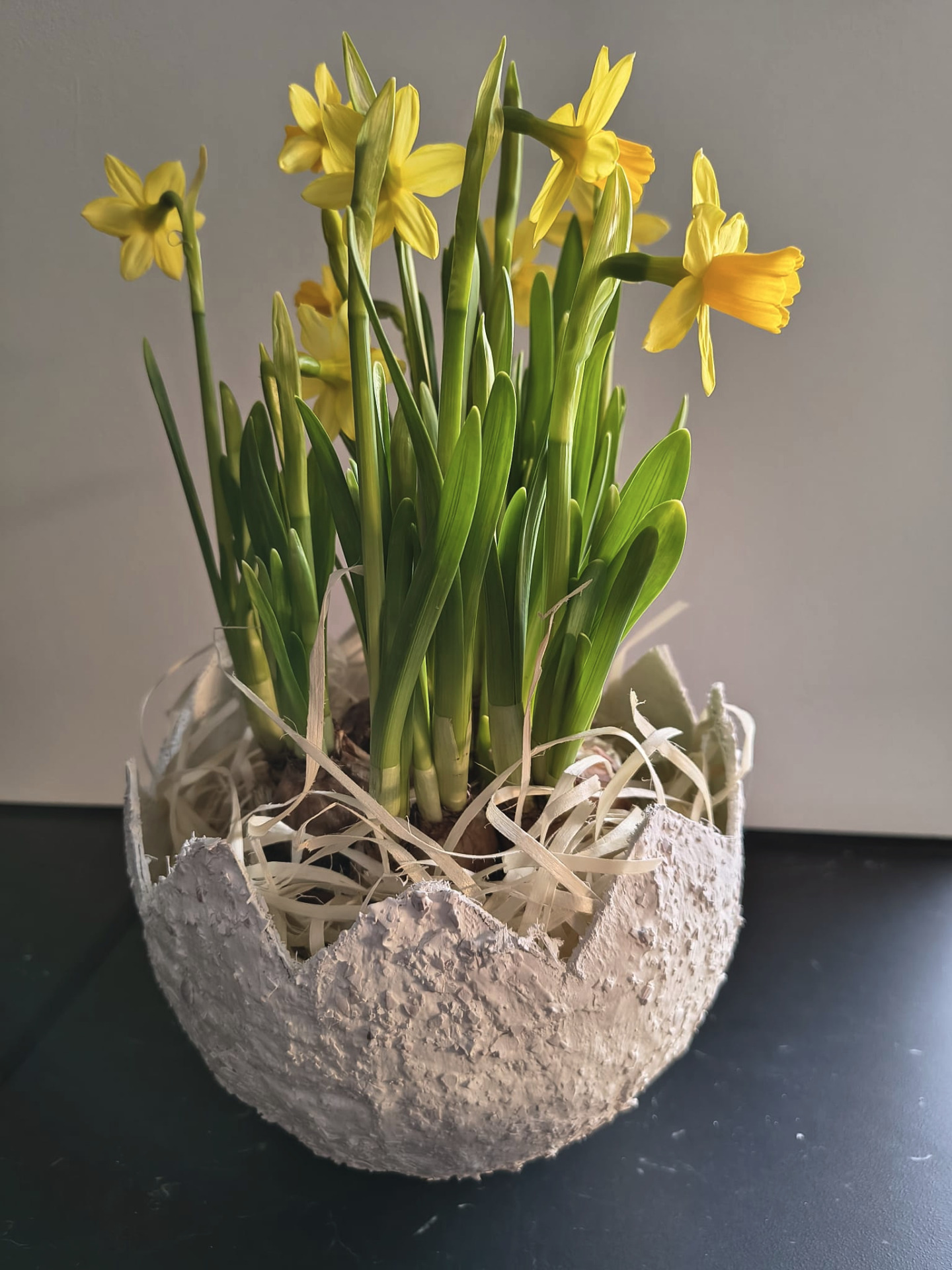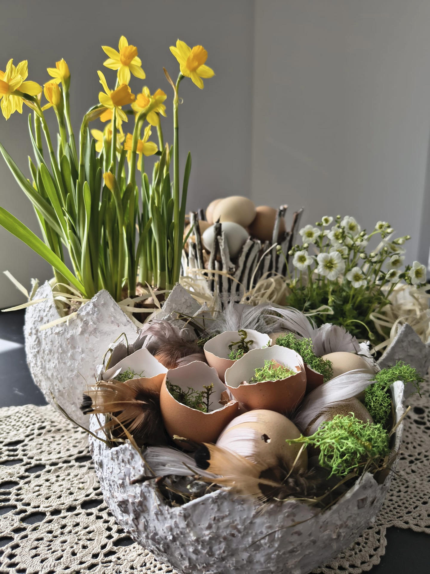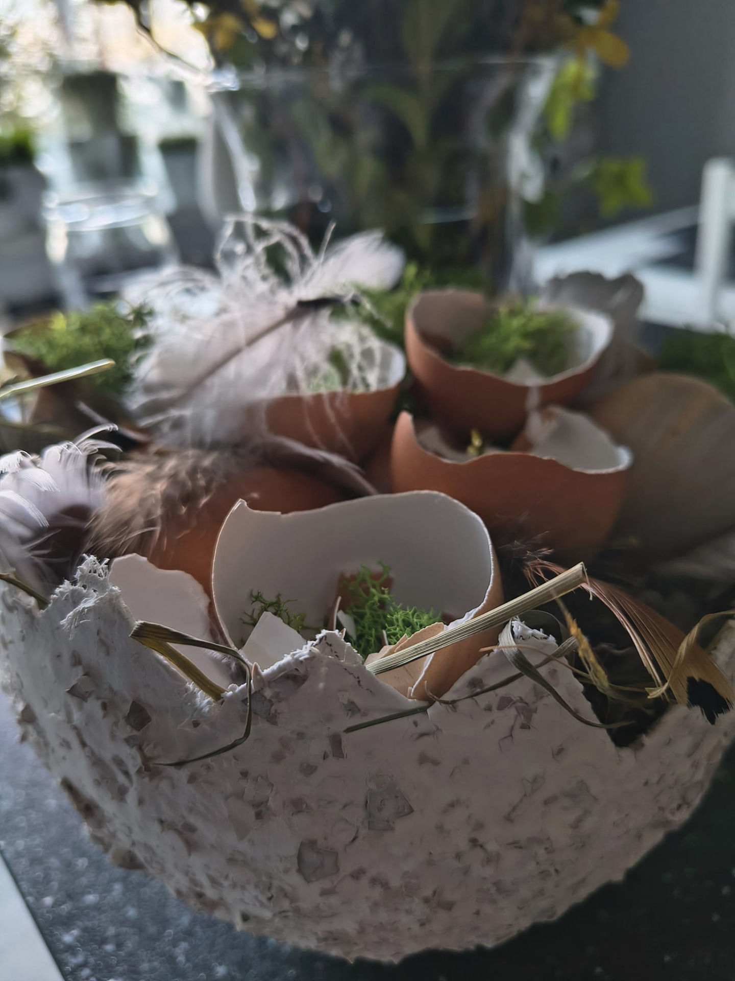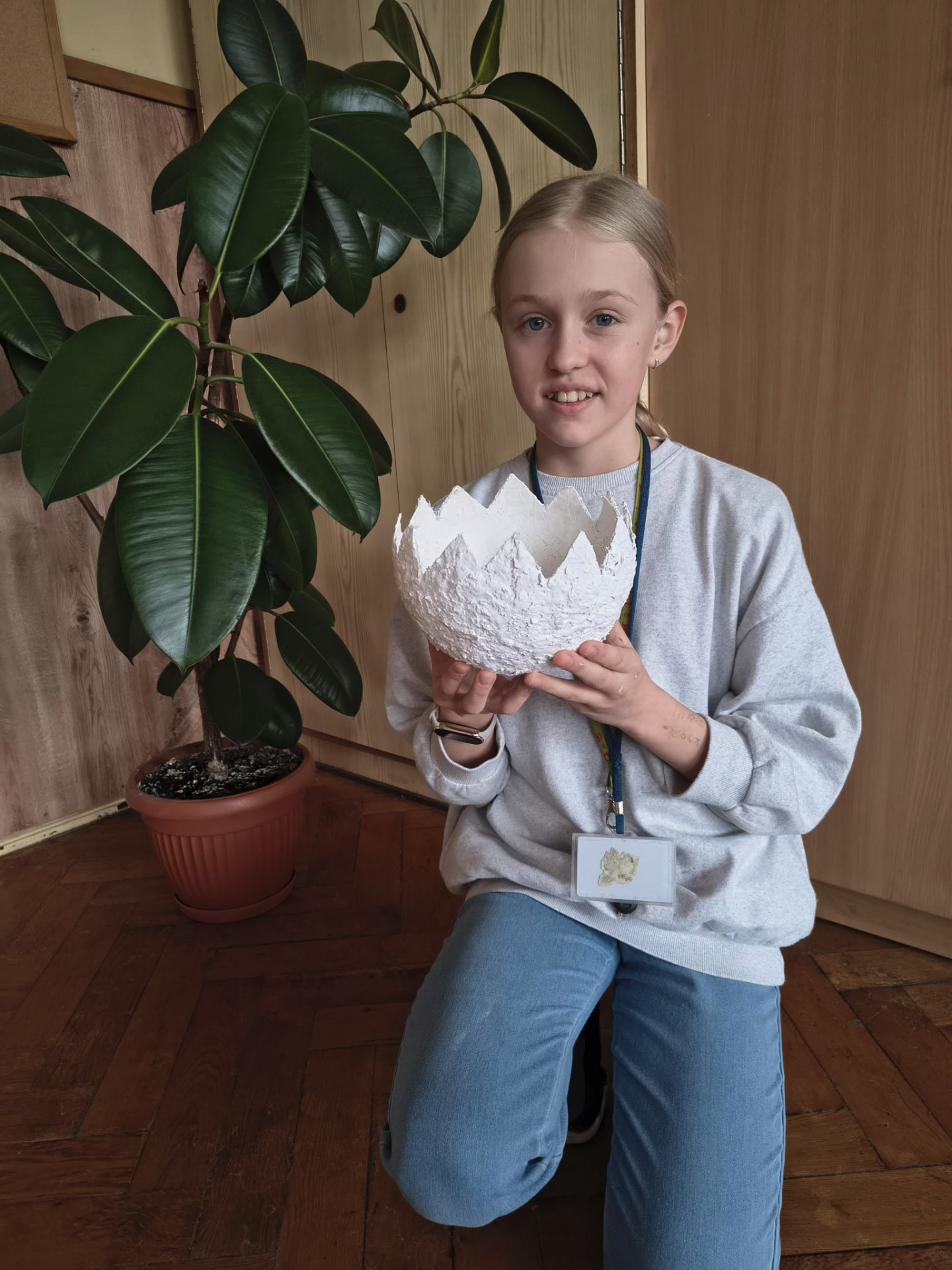 Po wysuszeniu dzieci misternie ozdobiły ją fragmentami prawdziwych skorupek, tworząc efekt delikatnej mozaiki. Kompozycję wzbogaciły kaczeńce z bibuły , drewniany płotek z patyczków po lodach i urocza gąska – symbol wiosny i odradzającego się życia.