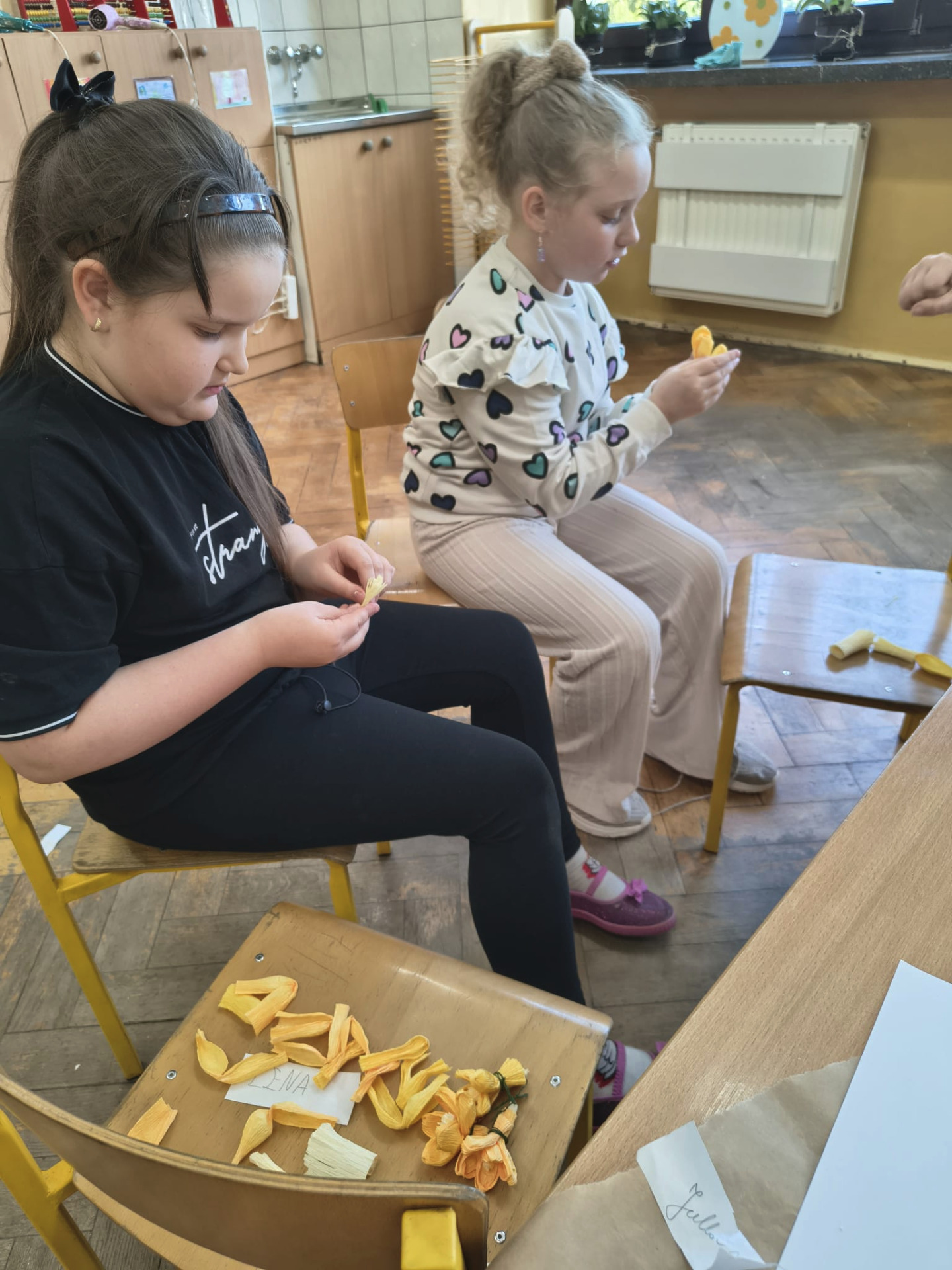 Na zajęciach koła zręcznych rąk nasi mali artyści pod czujnym okiem pani Agaty Polok wykonali stroiki wielkanocne, które zachwycają precyzją i pomysłowością. Bazą tych pięknych prac była własnoręcznie stworzona skorupka jajka, wykonana z balonika i bandaża gipsowego.