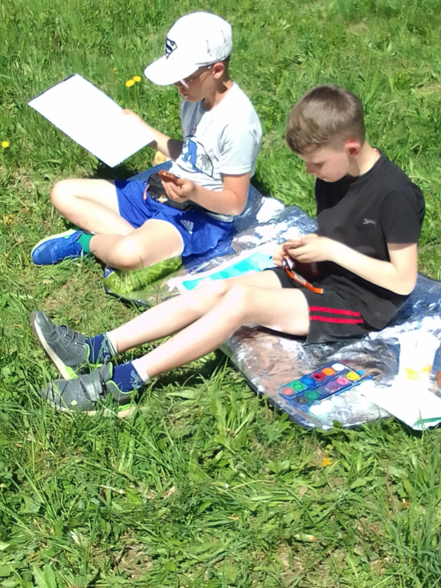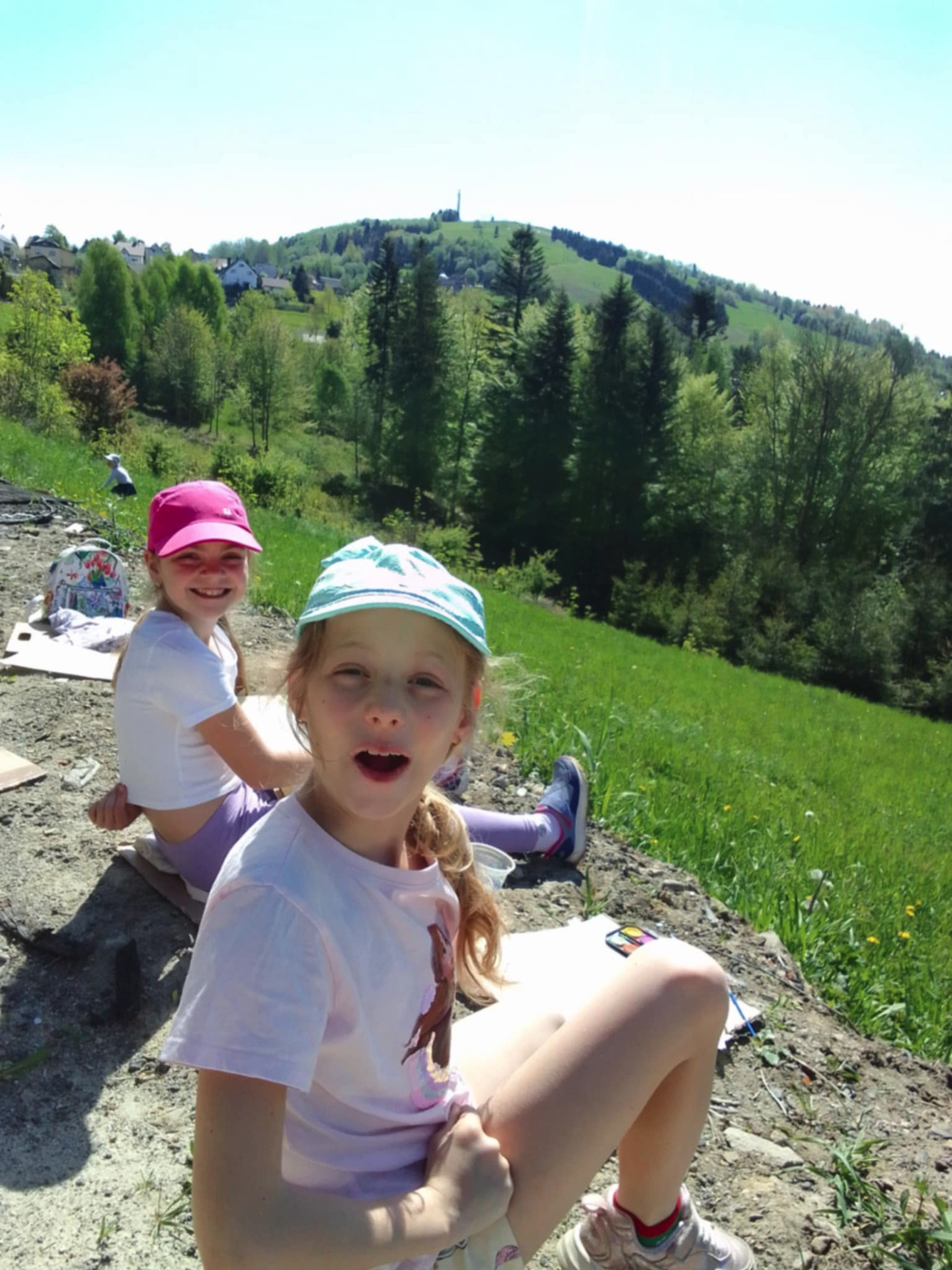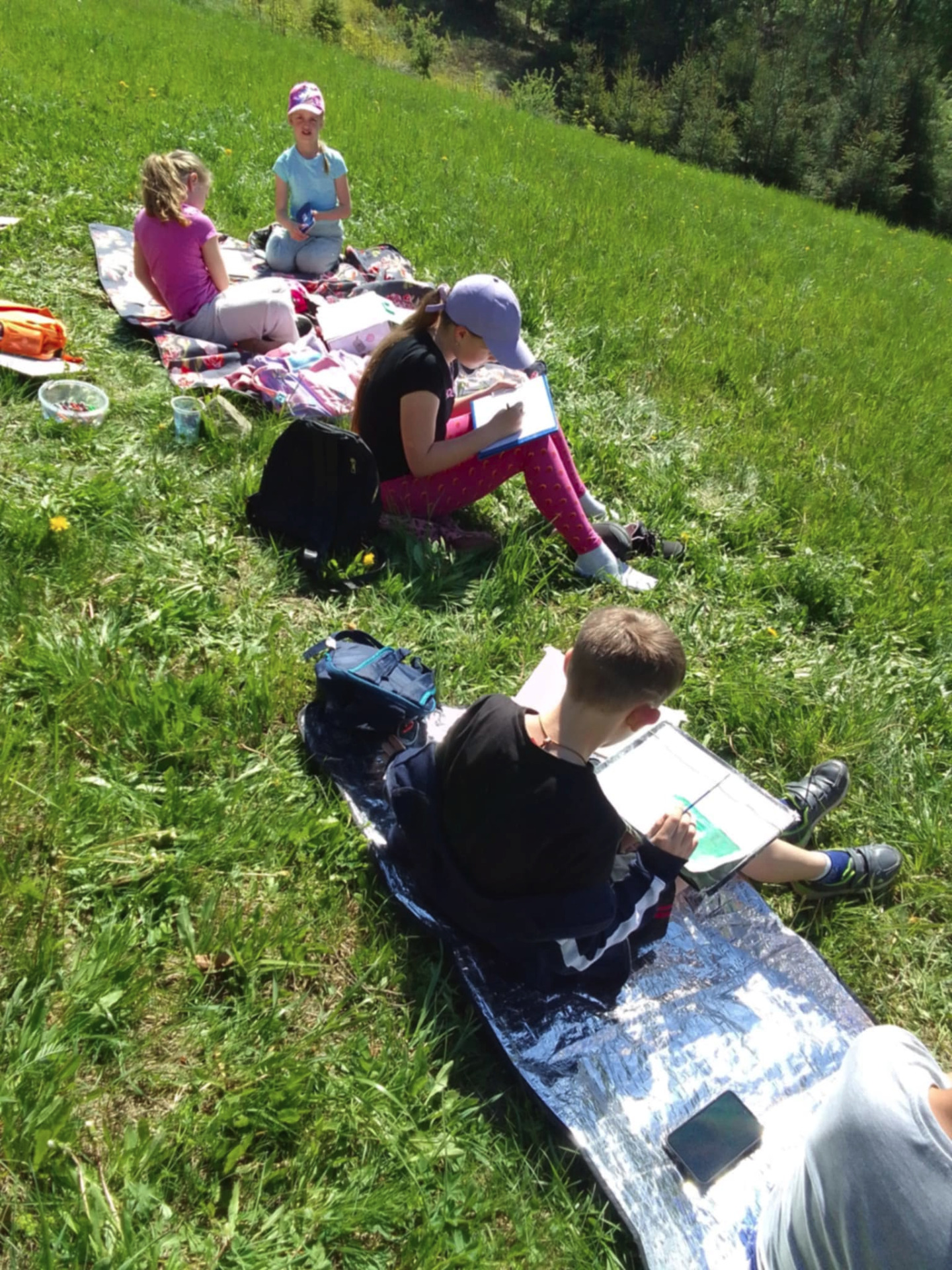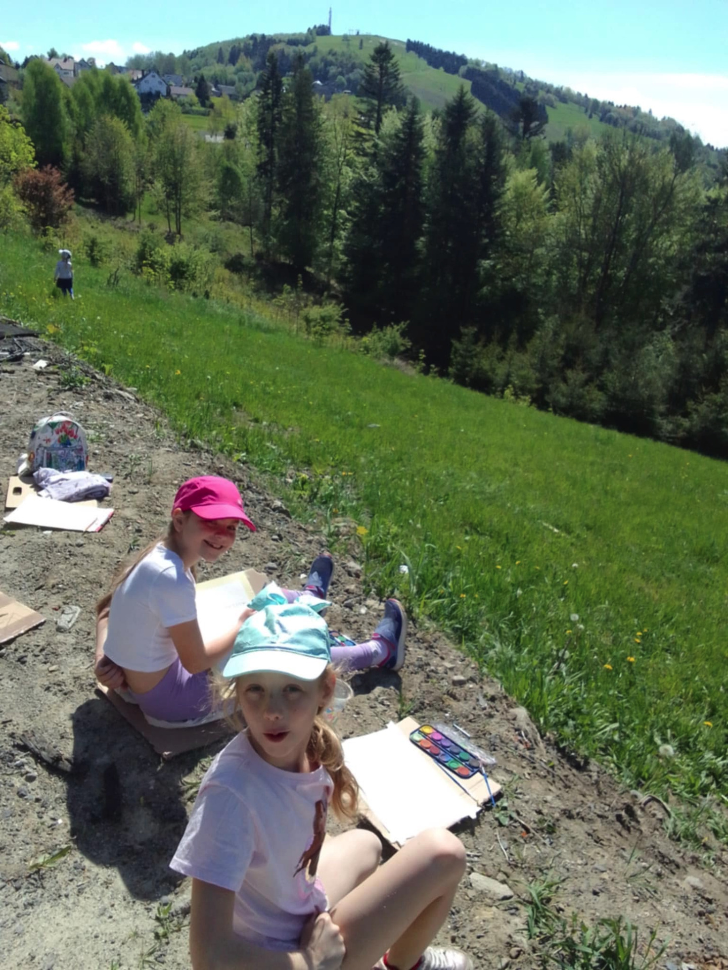 Kwitnąca łąka, ciepłe promienie słońca i majestatyczny widok na Ochodzitą stworzyły idealną scenerię do twórczej pracy. Dzieci chwyciły za farby i dały się ponieść wyobraźni, przenosząc piękno natury na papier.