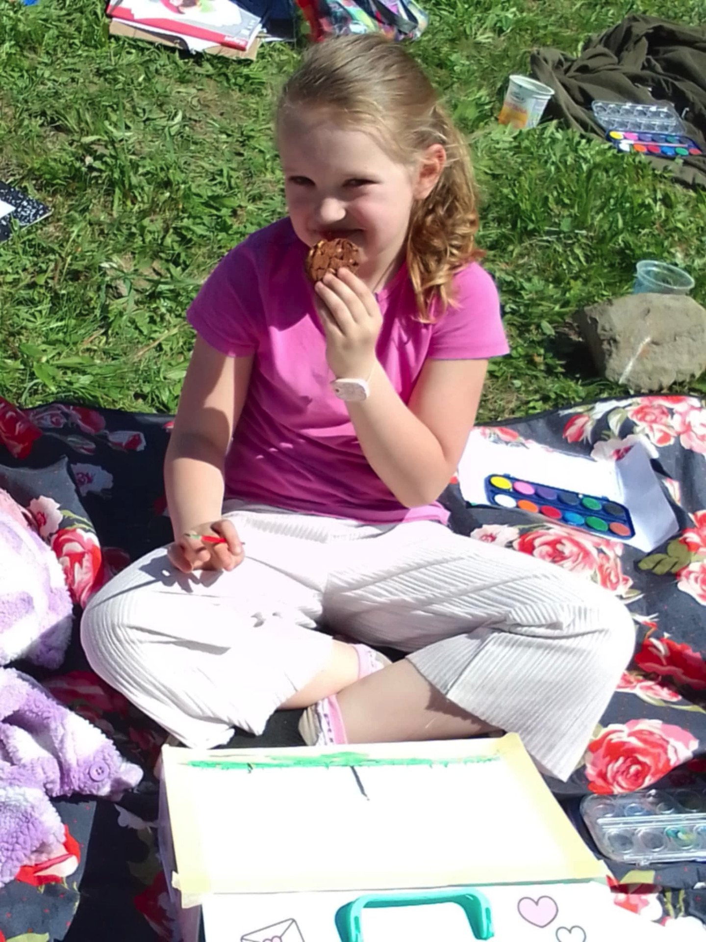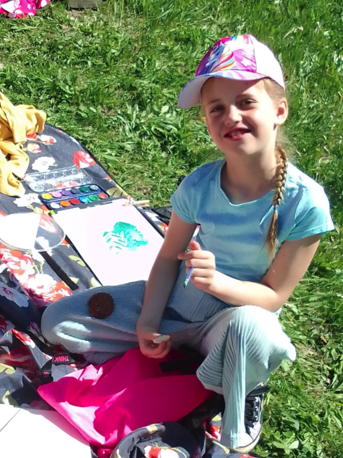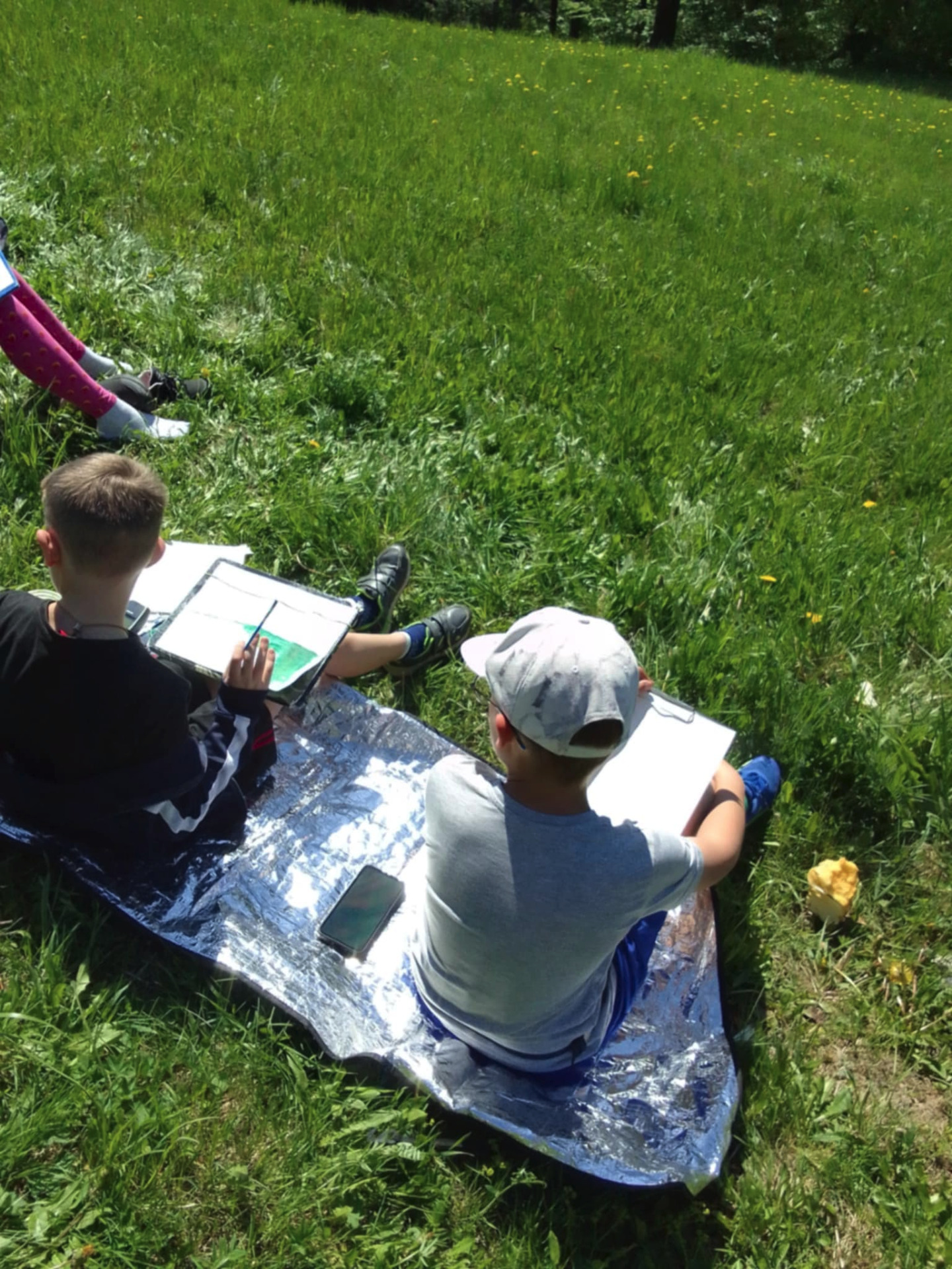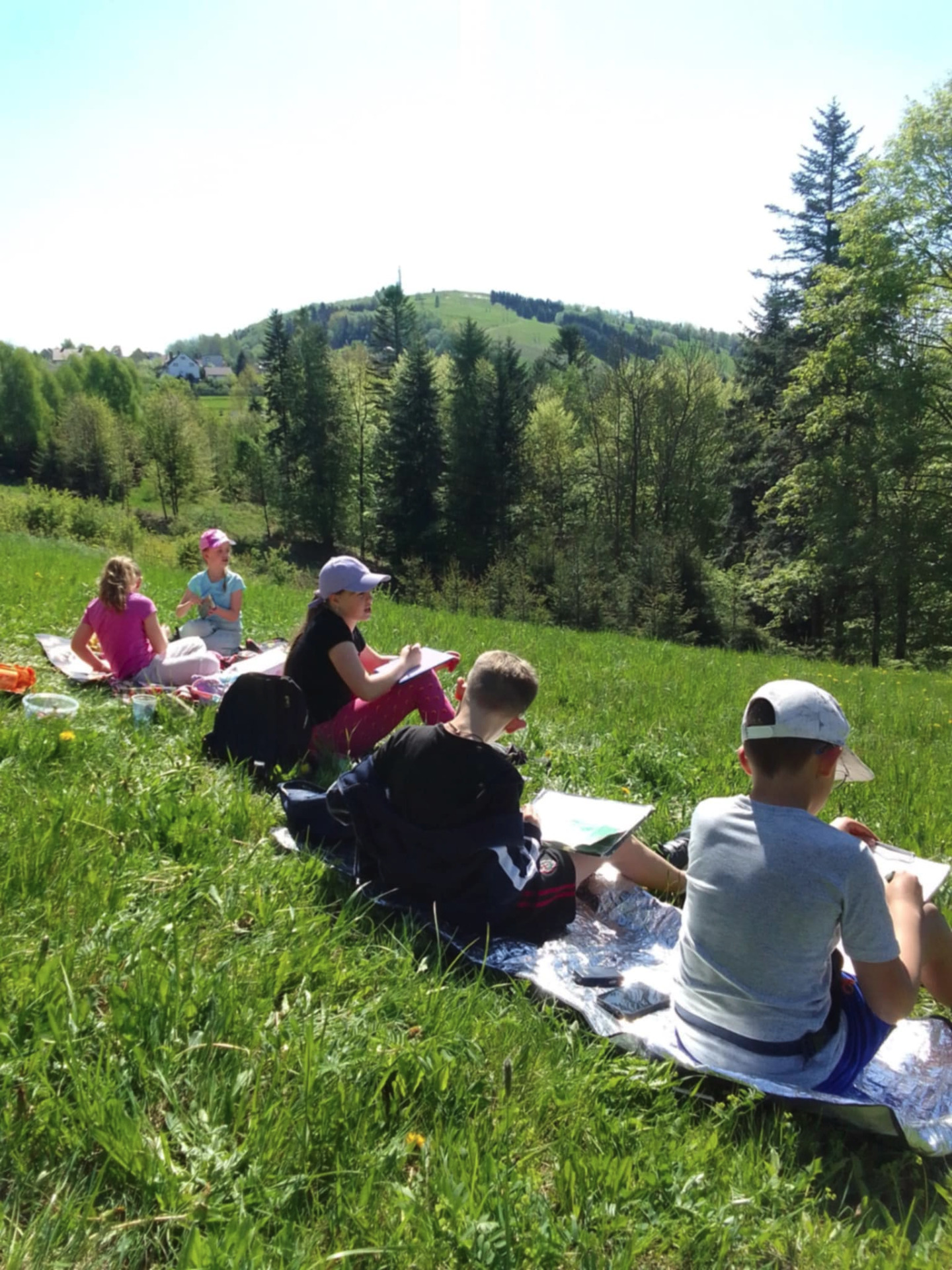 Kwitnąca łąka, ciepłe promienie słońca i majestatyczny widok na Ochodzitą stworzyły idealną scenerię do twórczej pracy. Dzieci chwyciły za farby i dały się ponieść wyobraźni, przenosząc piękno natury na papier.