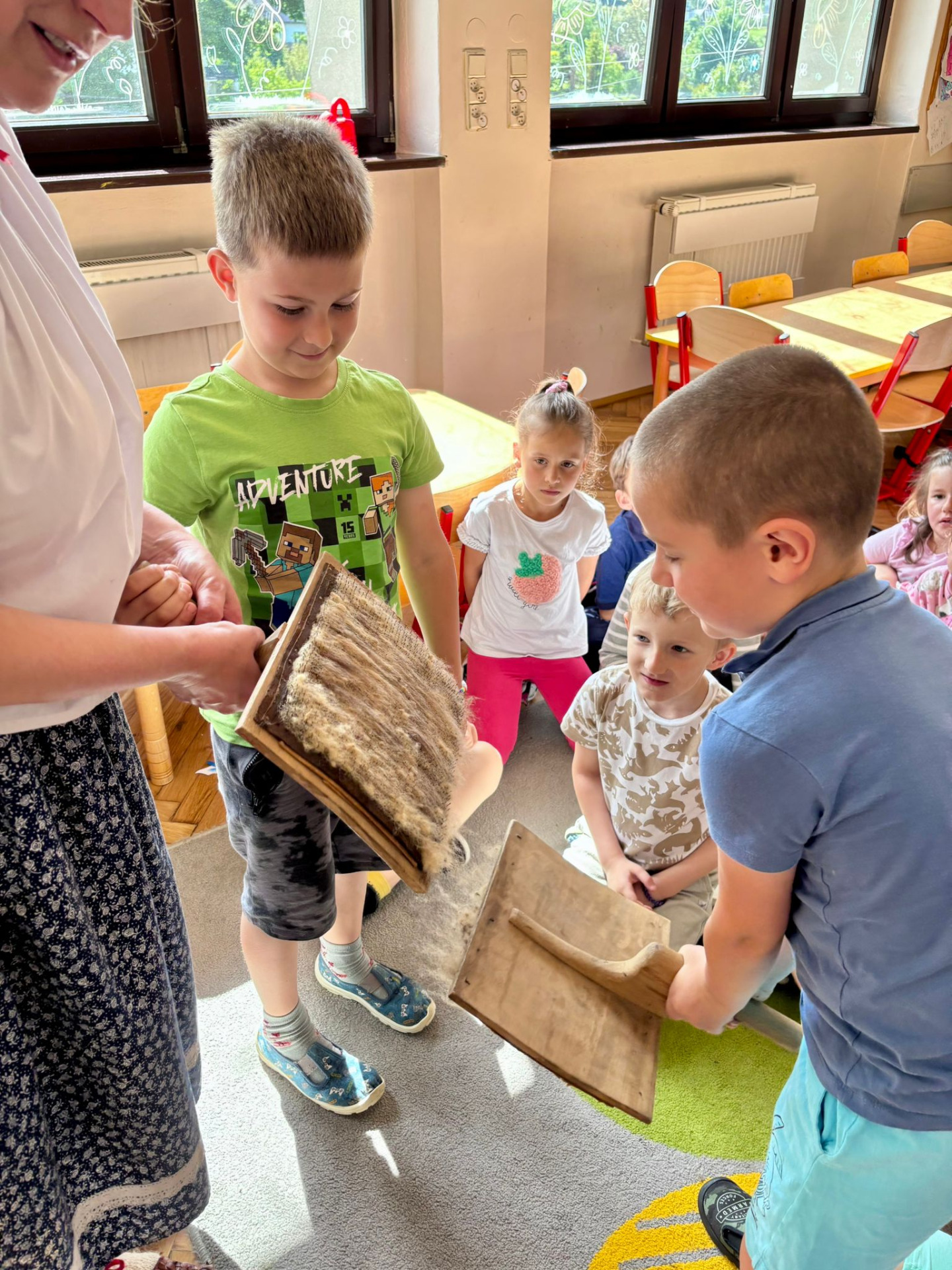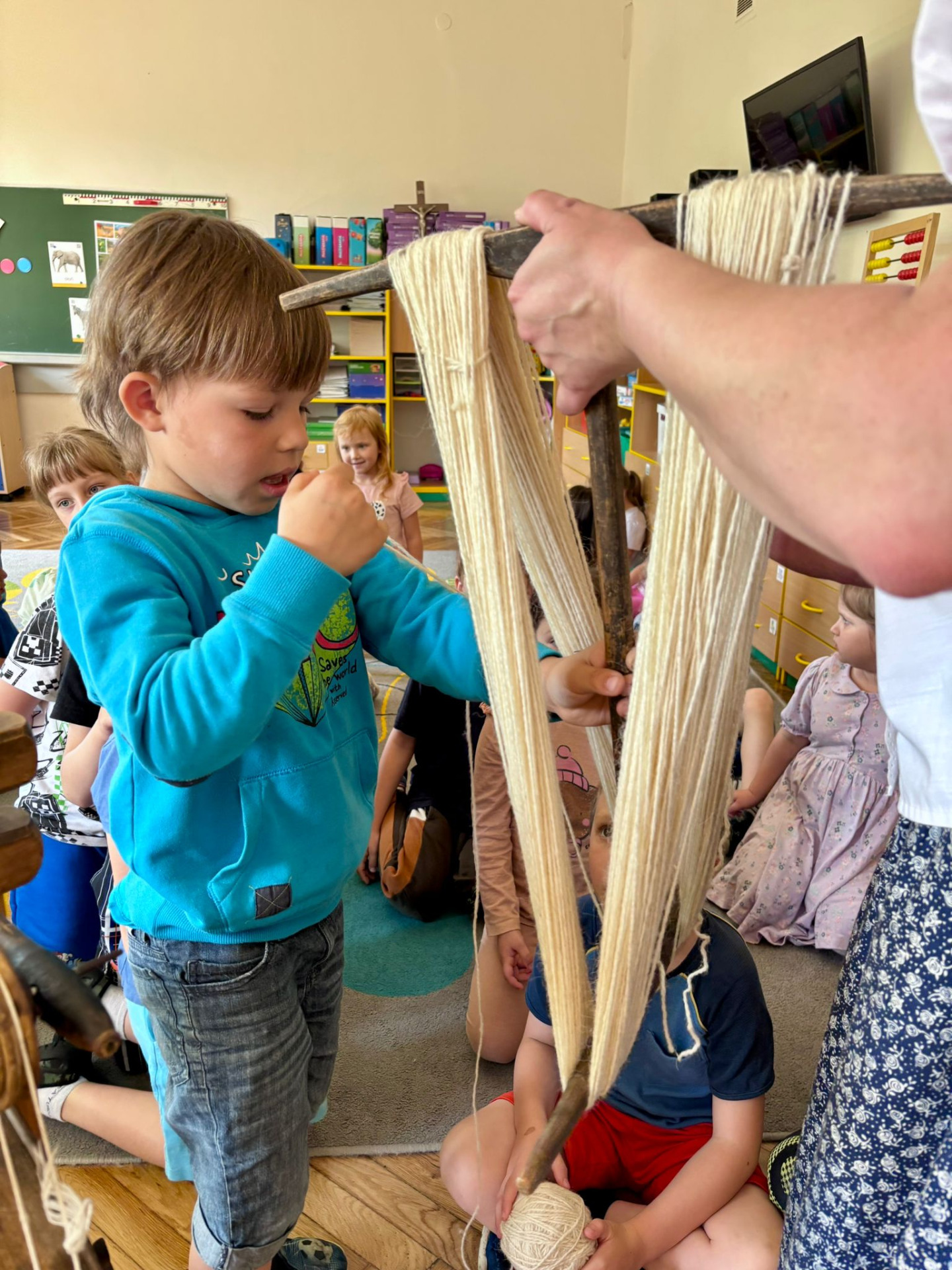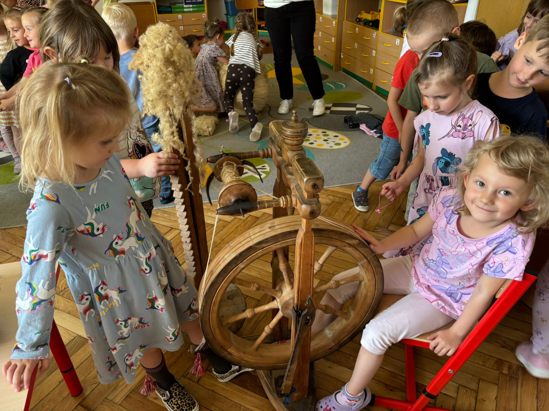 , krympli, kołowrotka, motowidła. Dzieci mogły poczuć miękką owczą skórę, ubrać na chwilę gunię z grubego sukna, a także... sprawdzić na własnej skórze, czym jest lanolina!
