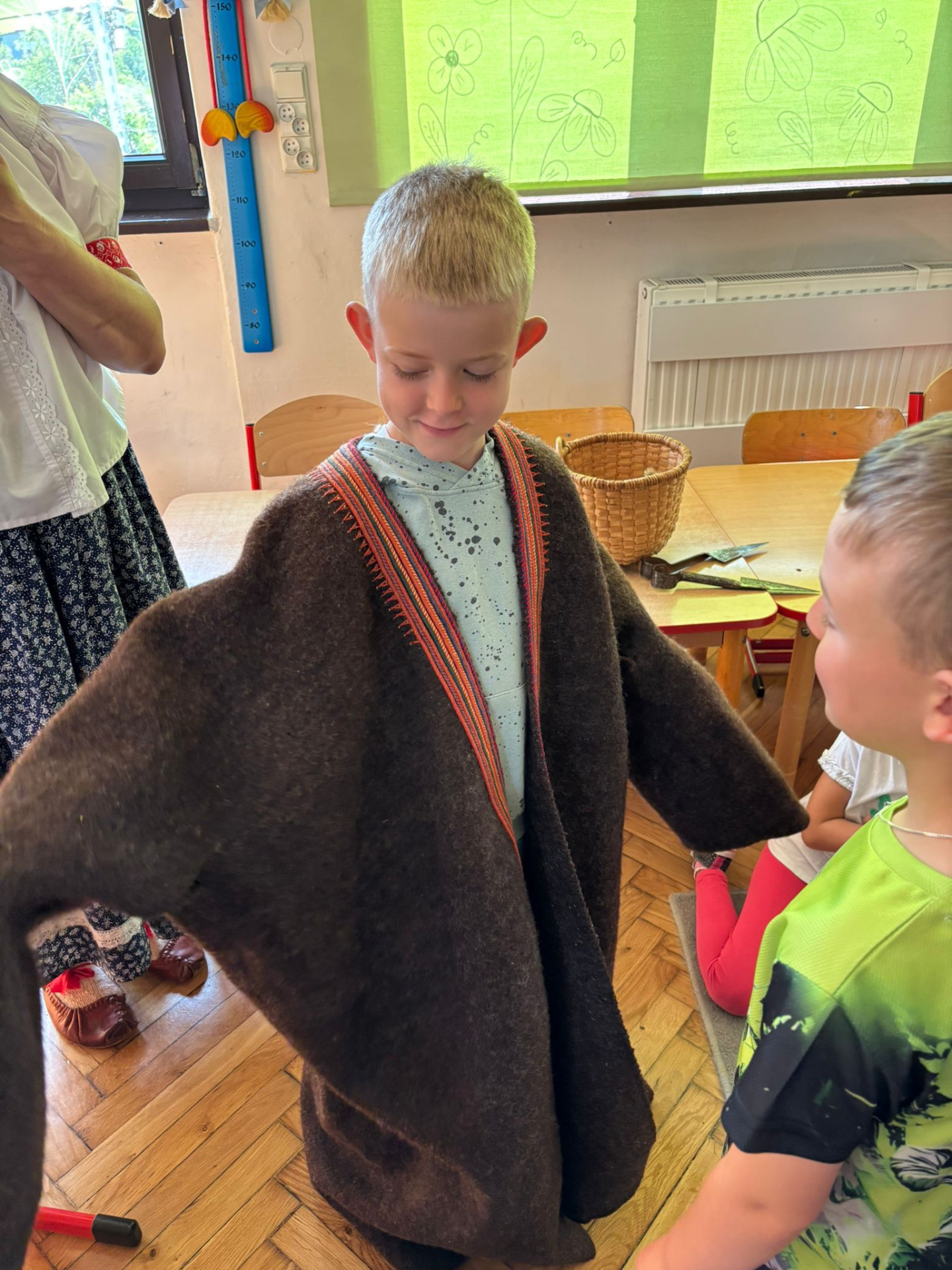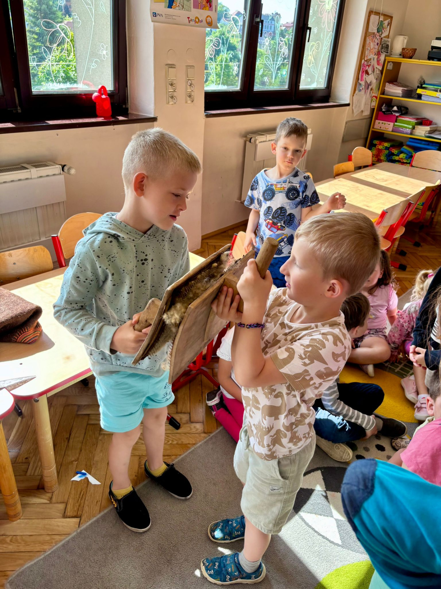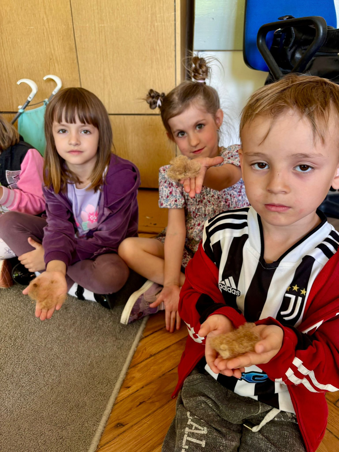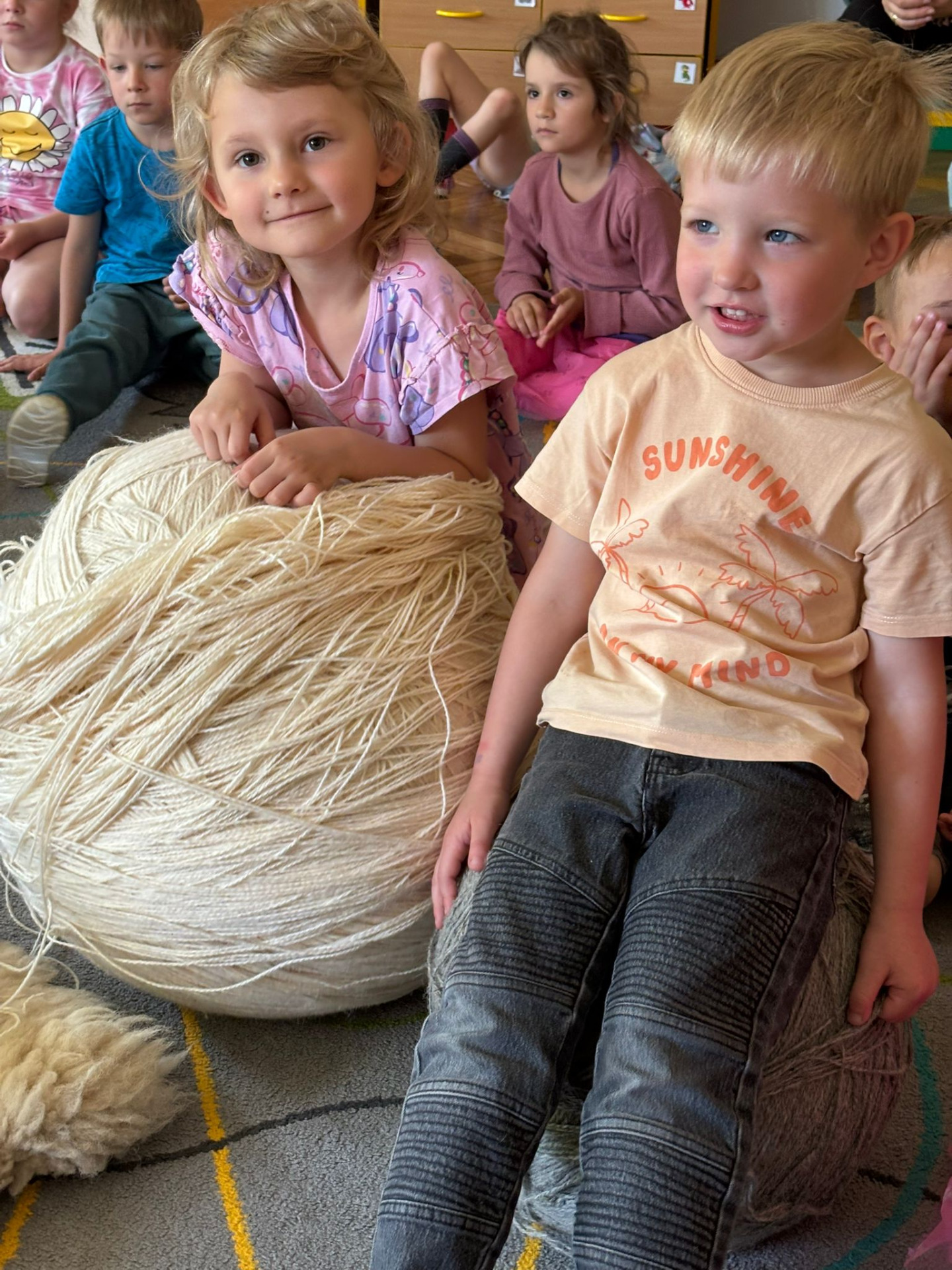 , krympli, kołowrotka, motowidła. Dzieci mogły poczuć miękką owczą skórę, ubrać na chwilę gunię z grubego sukna, a także... sprawdzić na własnej skórze, czym jest lanolina!