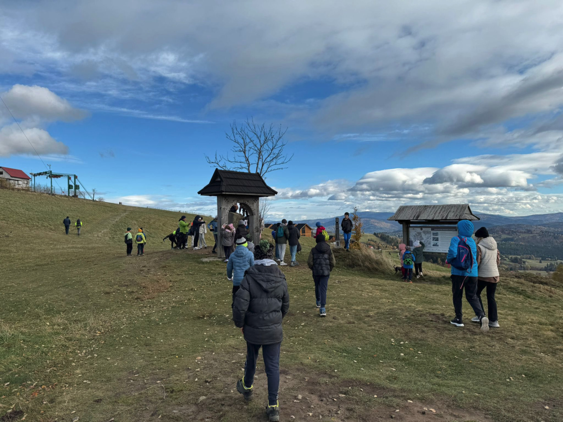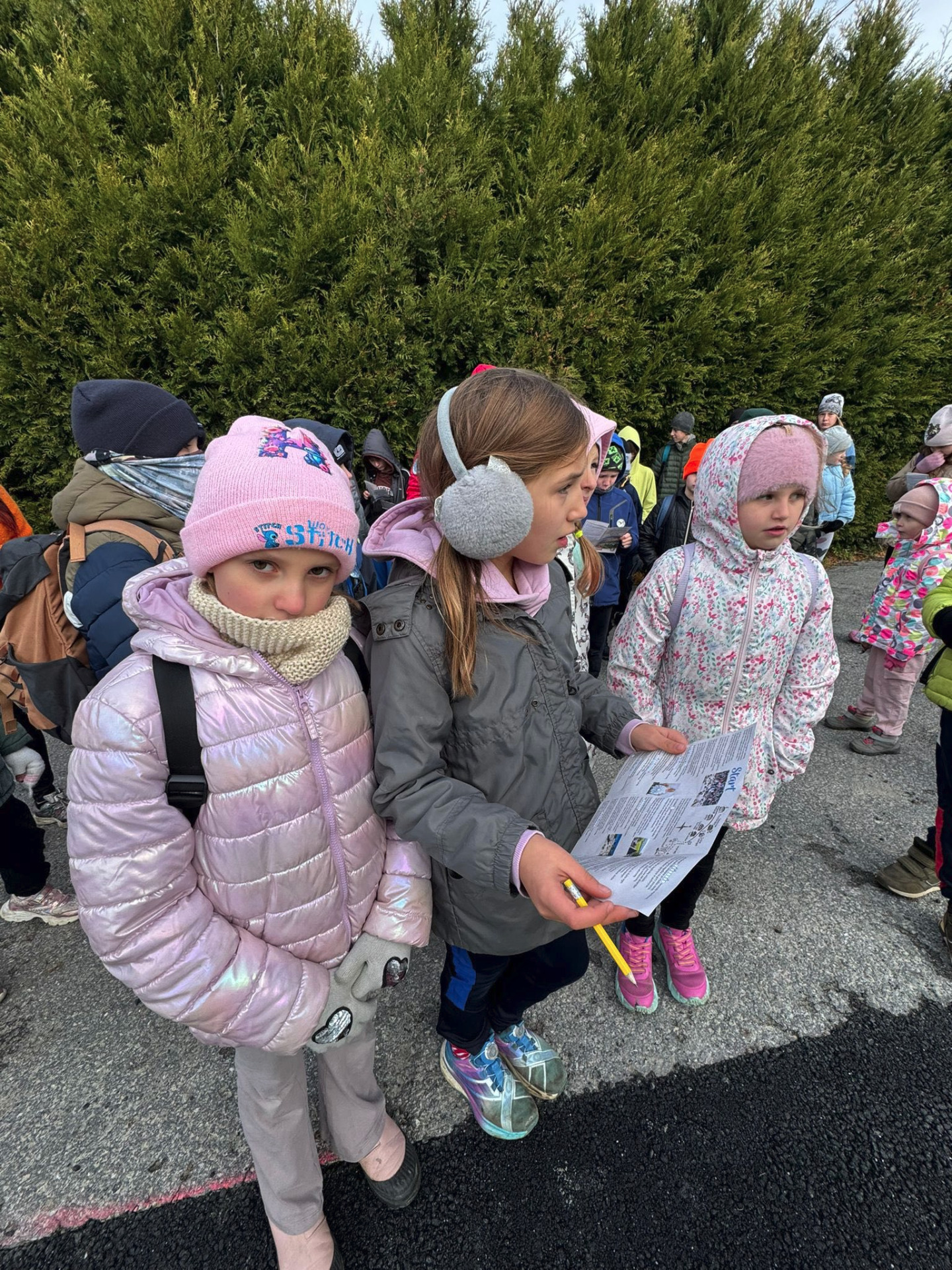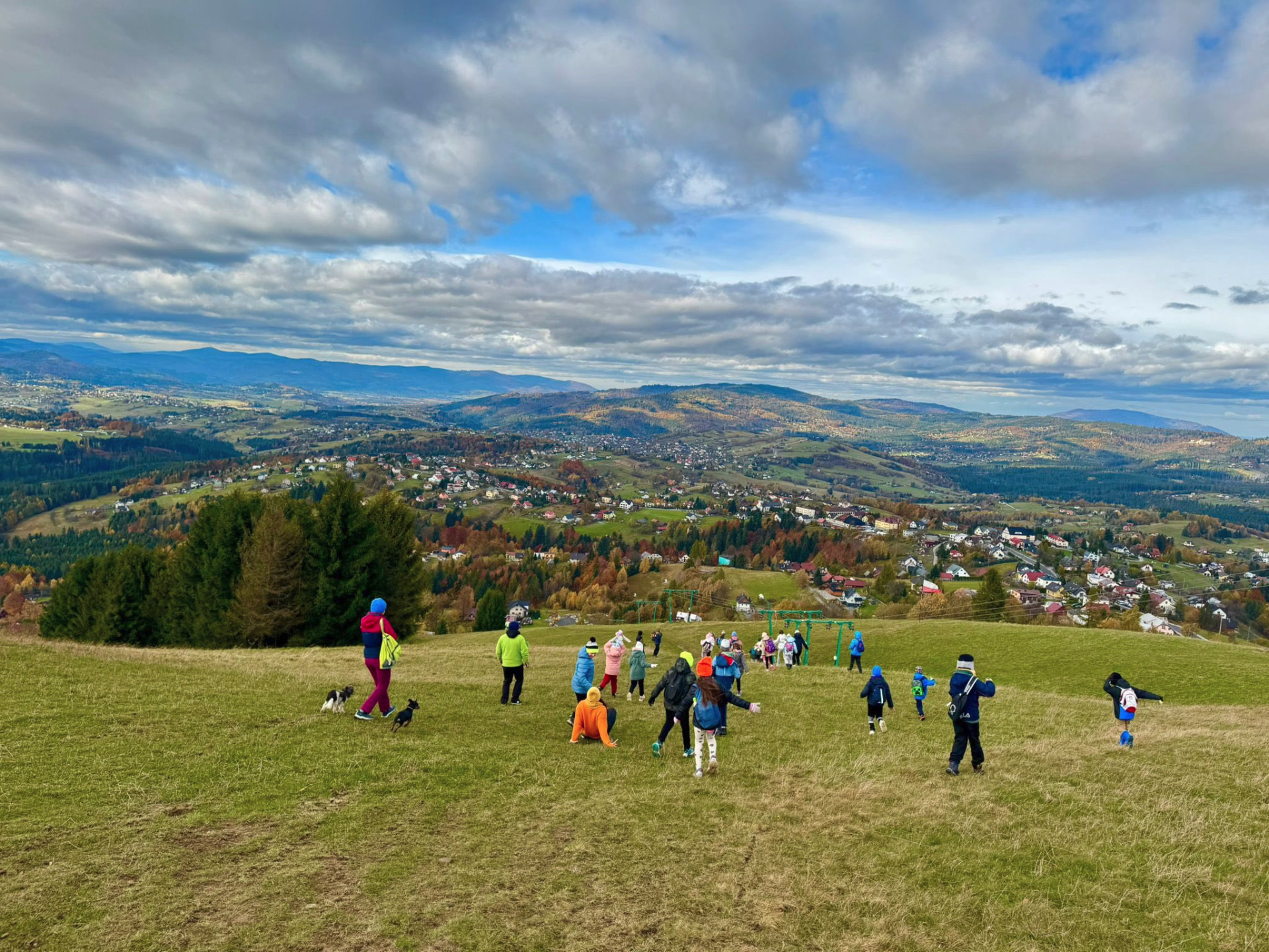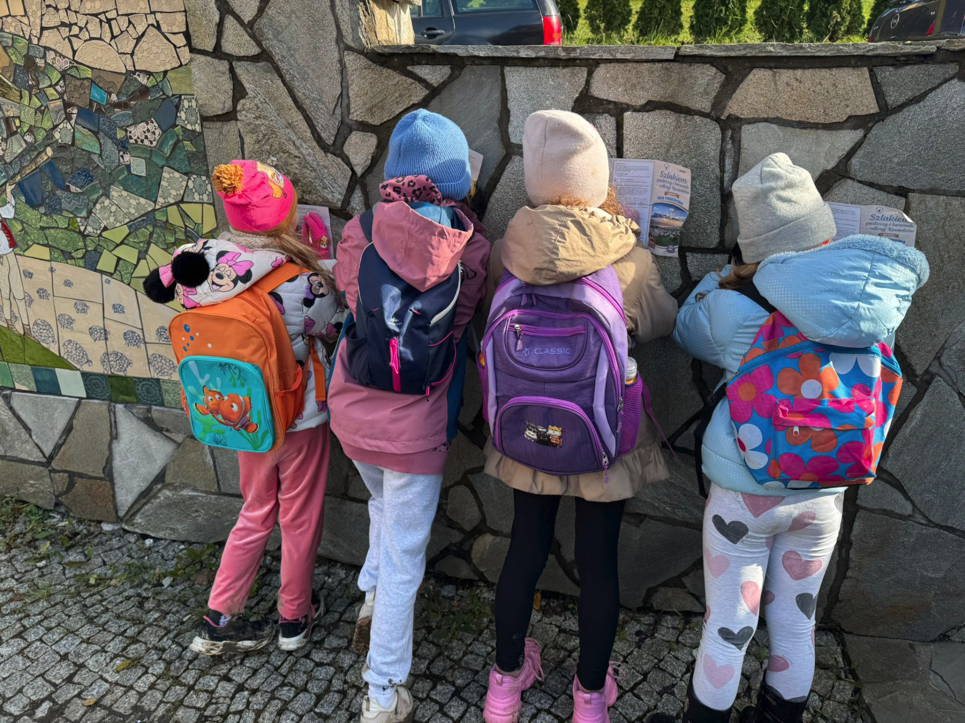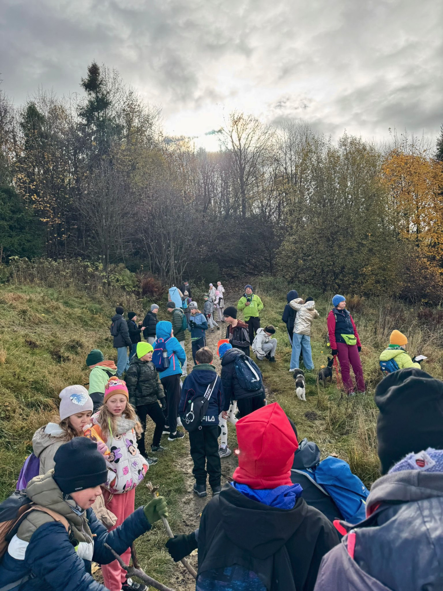 Dzieci otrzymały ulotki i wspólnie wyruszyły „szlakiem koronek i pasterzy”. Choć dzień był chłodny, słońce towarzyszyło nam przez całą drogę